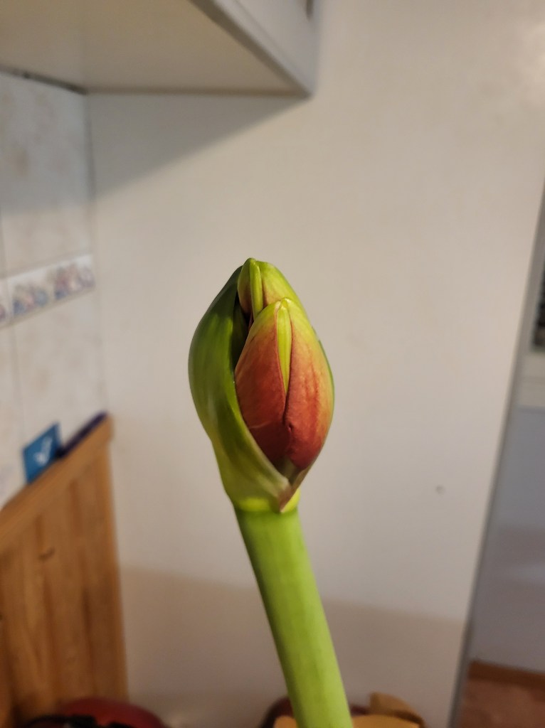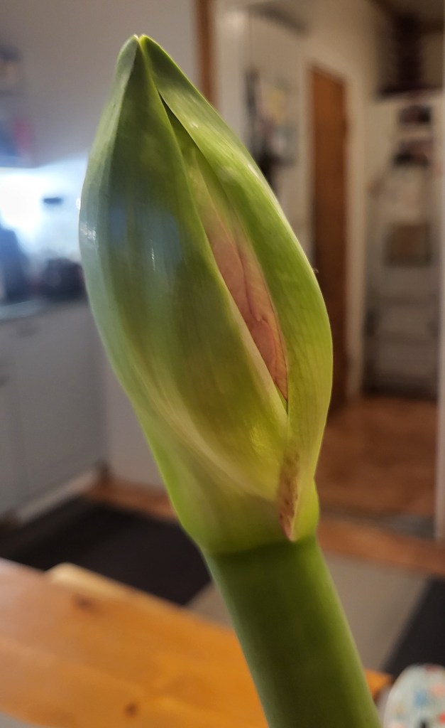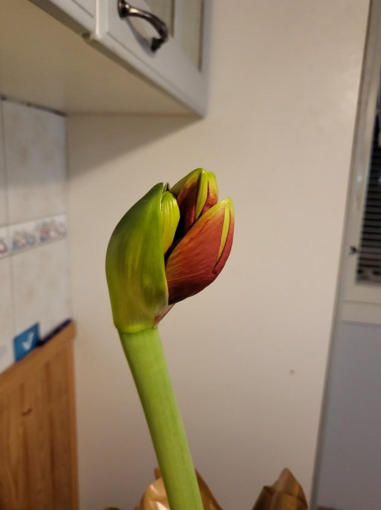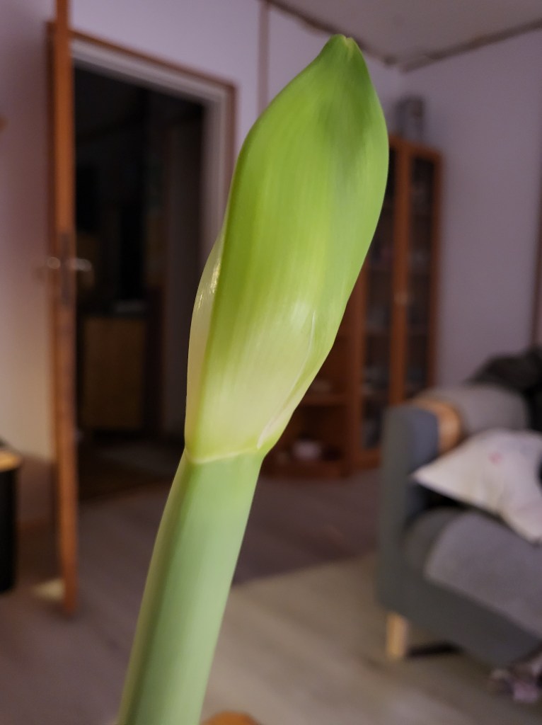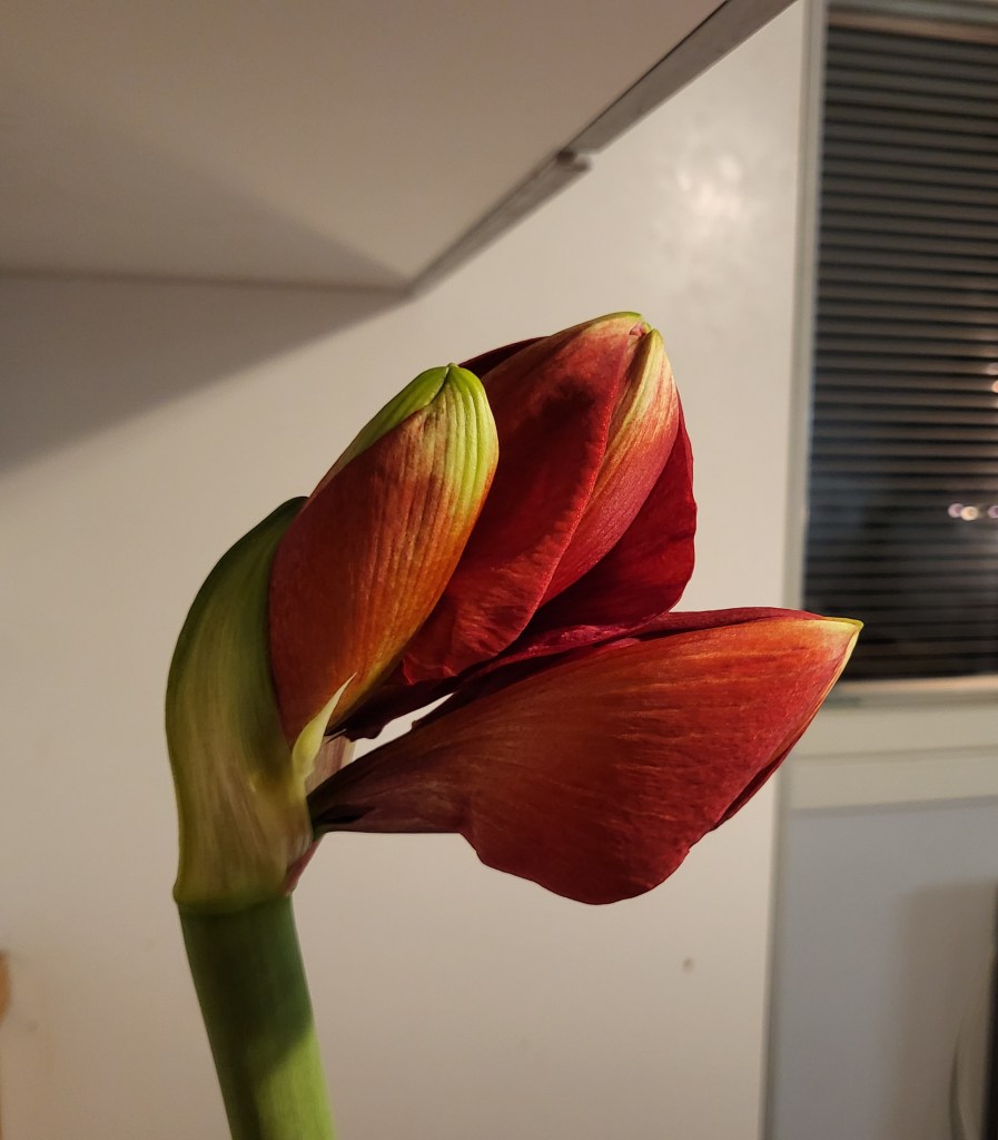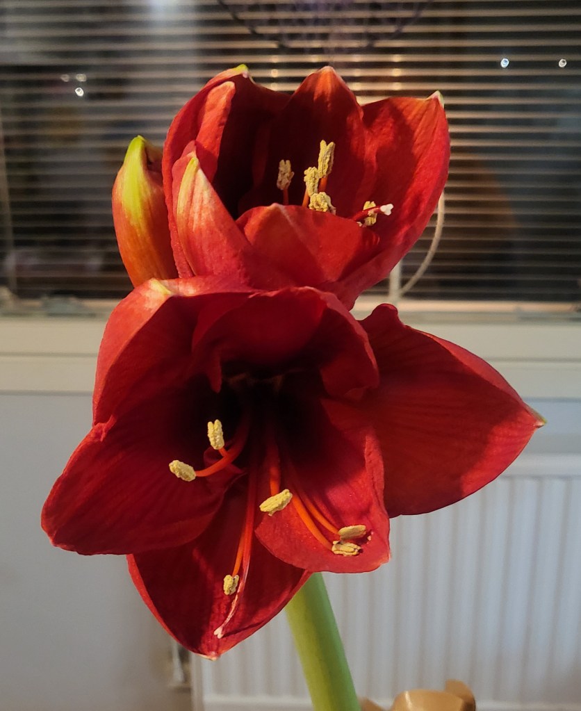 No, tämä tästä. Amaryllis sentään oli paukautellut kukkiaan auki päivän aikana, joten kahvin lisukkeeksi sain ihastella upeita kukintoja. Ainakin vielä ne kukinnot keikkuu siellä varren päässä, eli ehkäpä varsi sittenkin jaksaa kestää niiden painon.