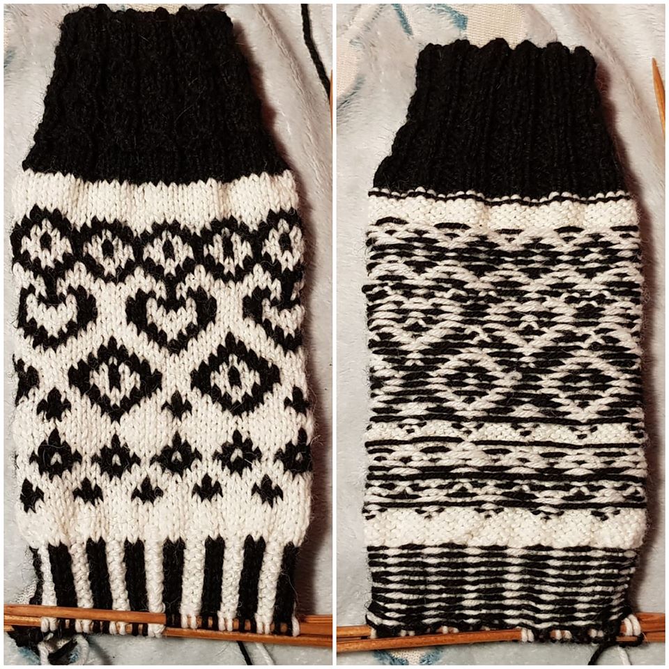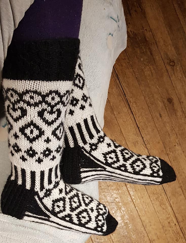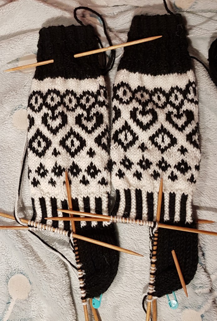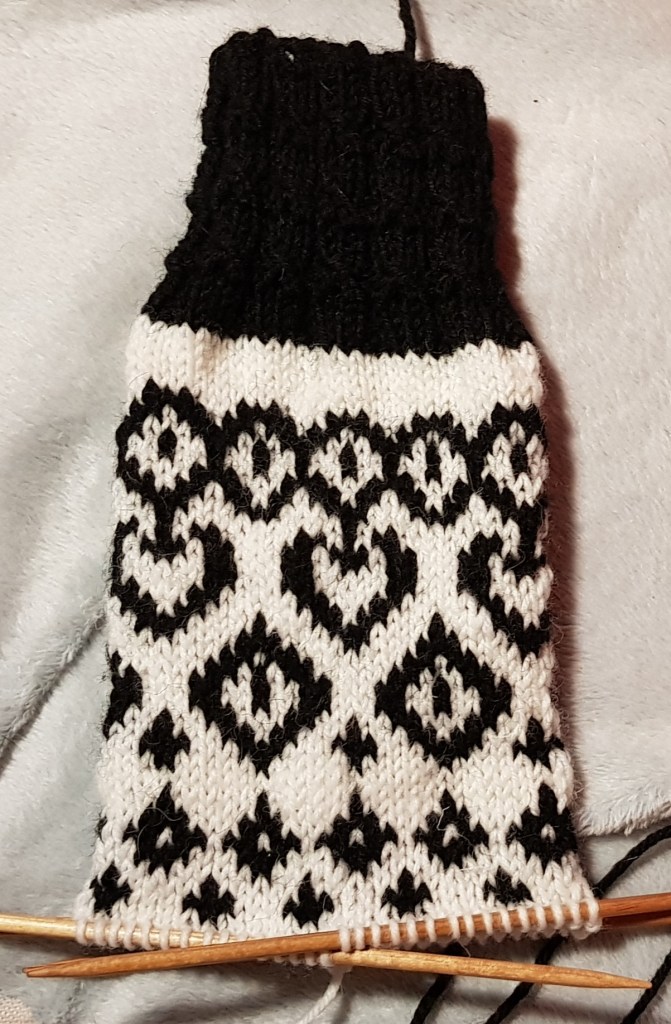 Kiilakavennusten jälkeen kudoin kuvioinnit loppuun. Viimeisen kuviokerroksen jälkeen kudoin jalkapöydän puolella kerroksen valkoista ja vaihdoin sen jälkeen puikkojen kooksi 3,5 samalla kun siirryin pelkkään mustaan lankaan ja kutomaan kärkikavennuksia. Kärkikavennus on jälleen kerran sädekavennus.