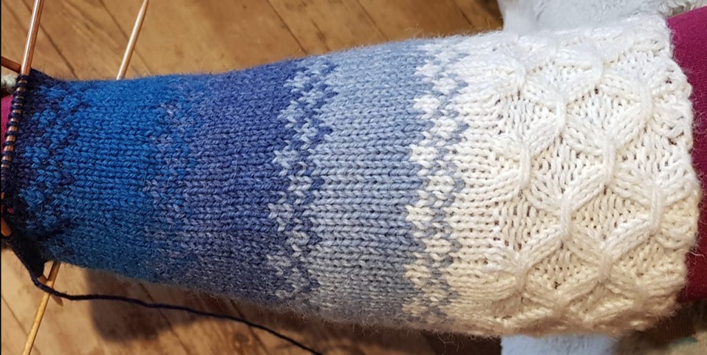 Itse kudoin neljästi ”smokkikerroksen”, jonka jälkeen kudoin vielä kaksi kerrosta 2o, 2n-joustinta. Siirryin pelkkiin oikeisiin silmukoihin ja samalla laskin silmukoita kutoen aina 9. ja 10. silmukan yhteen. Näin jokaiselle puikolle jäi 18 silmukkaa eli 80 -> 72. Tämän jälkeen kudoin vielä muutaman kerroksen valkoisella jonka jälkeen lähdin toteuttamaan mallikaaviota.