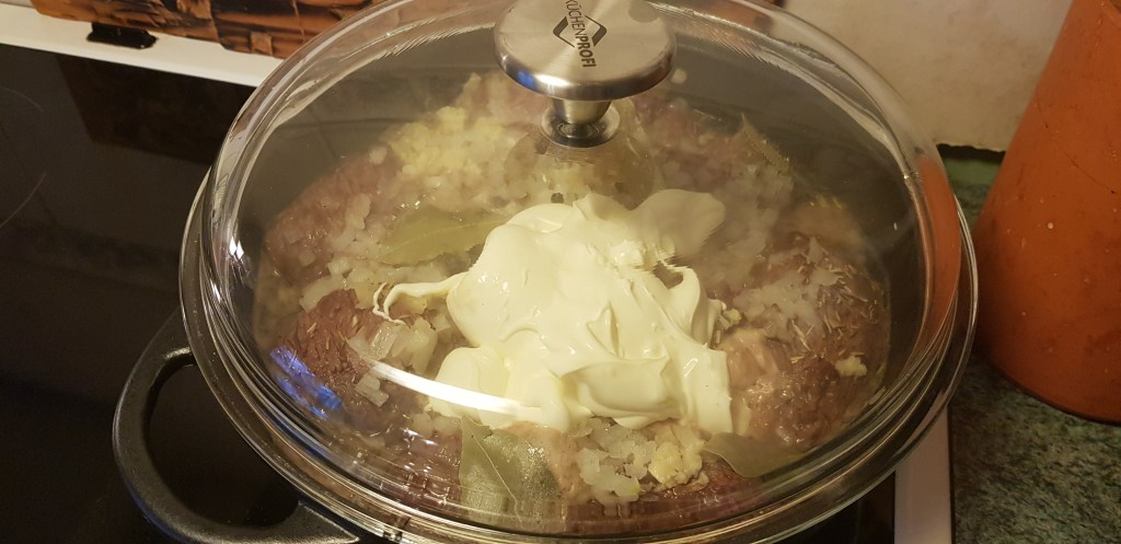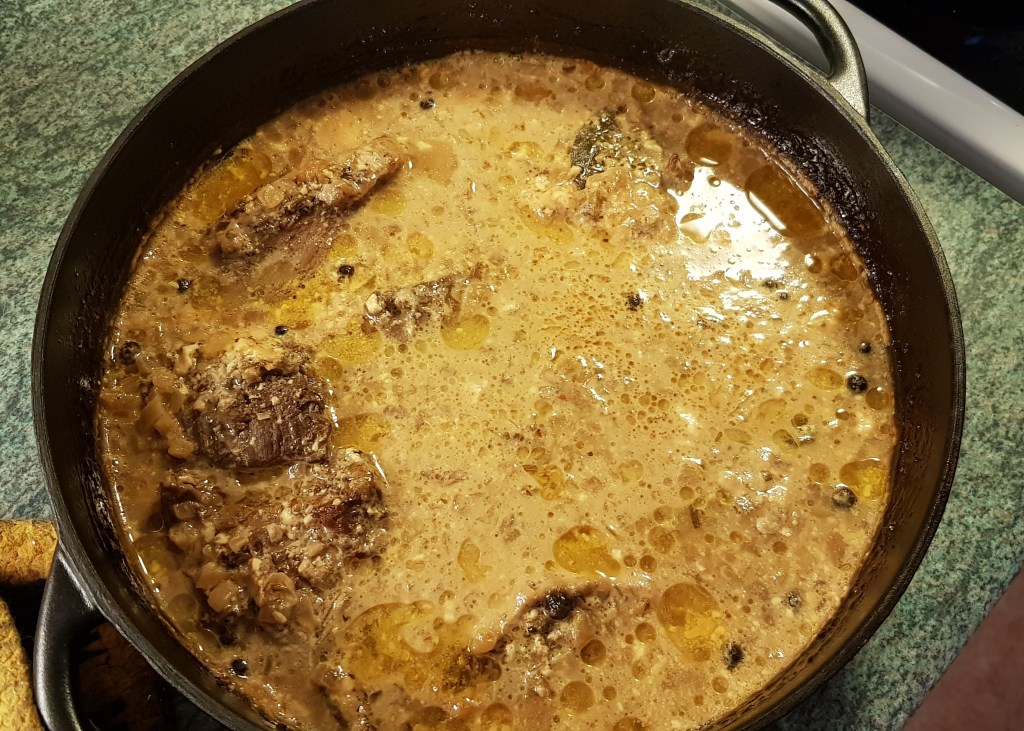 Nostin kaikki lihat takaisin pataan, pyöräytin useamman pyöräytyksen myllystä makua päälle. Kippasin kuumaan pataan puolisen tölkkiä olutta ja päälle vettä niin, että lihat peittyi. Pussi sipulikuutioita niskaan, sen päälle valkosipulikynnet murskeena ja vielä laakerinlehdet ja pippurit.