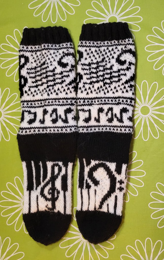 Vaihteeksi musiikillista menoa ja villasukkia. Näissä on lankana seiskaveikka, kudoin nämä 4mm chiaogoon pyöröillä. Kuvat on löytyneet pitkältikin Pinterestistä, tosin muokkailin niitä itselleni paremmin sopiville silmukkamäärille. Jalkaterään tahdoin lisätä vielä nuottiavaimet, joten muokkailin nekin Knitbirdillä kaavioihin.