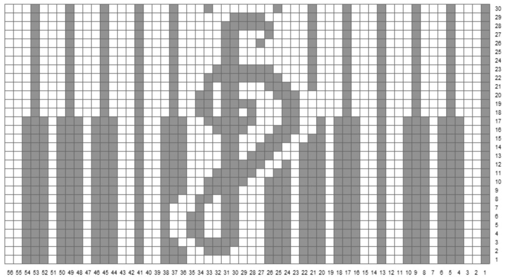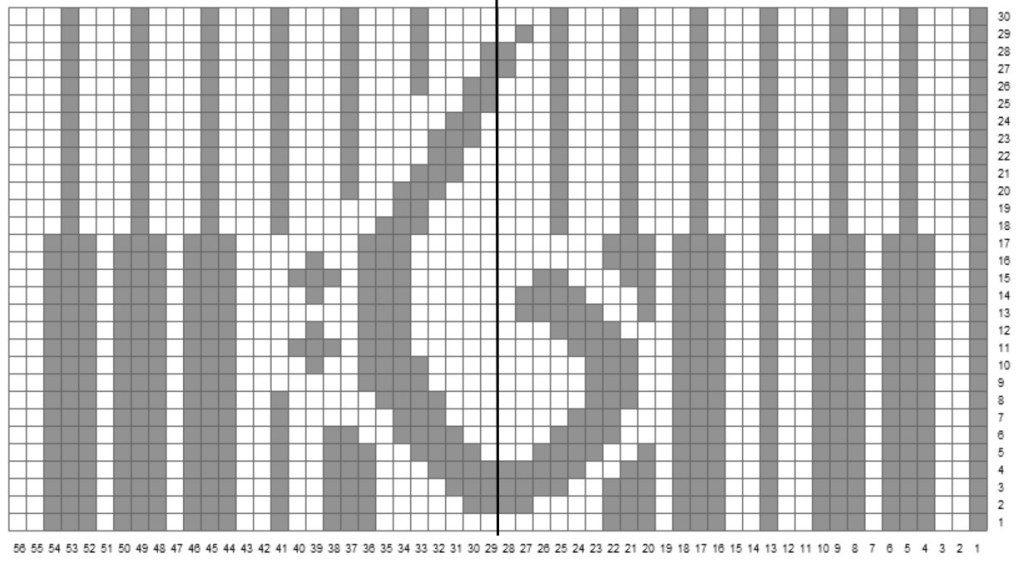 Nuottiavain osuuden valmistuttua kavensin yhden silmukan jokaiselta puikolta 64 ->60 ennen kuin aloitin nuottikuvioinnin 60 silmukalla.