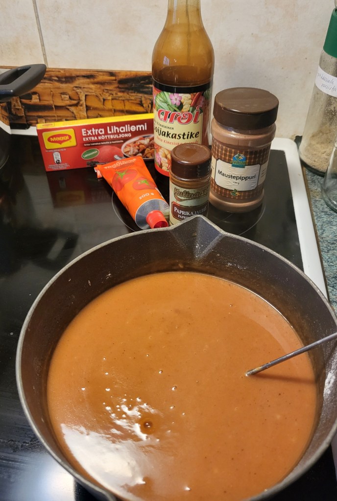 Kuten sanottua, ruokaa oli silti tehtävä ja päädyin tekemään nakkisoosia. Nakkisoosi on siitäkin hyvä valinta, että isäntä ei sitä tee joten enpä edes muista koska sitä viimeksi on ollut. Minähän en ole muuten tähänkään päivään mennessä oppinut jauhojen kuivaruskistusta, joten meillä kastikkeen väri tulee soijasta, lihaliemestä, tomaattipyreestä ja paprikasta.