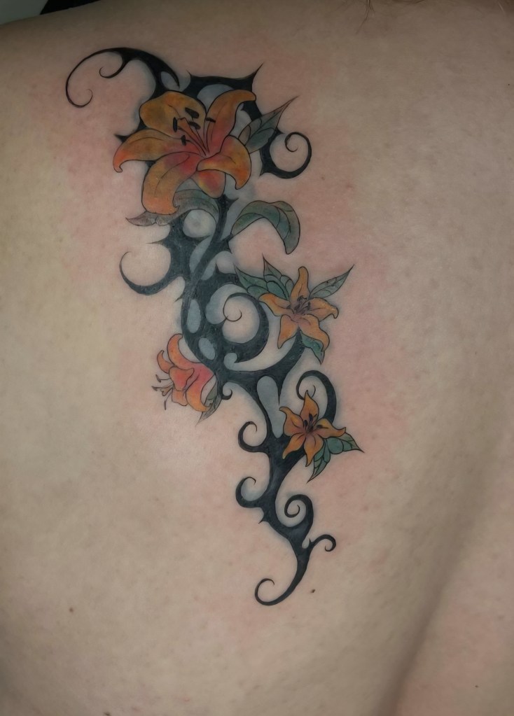 Kaveri lähetti kuvan tatuoinnistaan, joka oli saanut viimeinkin uutta väriä pintaan. Samalla tatuoija oli siistinyt ääriviivoja ja keksinyt jättää vanhan tatuoinnin tummuutta varjostuksiksi. Aika kivan näköinenhän siitä tuli, pakko myöntää.