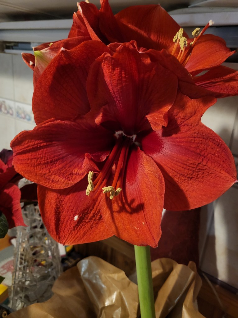 Ai muuten, amaryllis se vaan komeantuu päivä päivältä. Pitkästä aikaa päätin antaa pienen tilkan vettä kummallekin amaryllikselle, olkkarin mallihan intoutui paisuttamaan nuppuaan liki silmissä vettä saatuaan. Keittiössä keikkuva ex-elämäänsä kyllästynyt puolestaan levitti kukintoaan vielä lisää, joten ehkäpä ne olivat sen tilkan tarpeessa kumpainenkin. Ehkä.