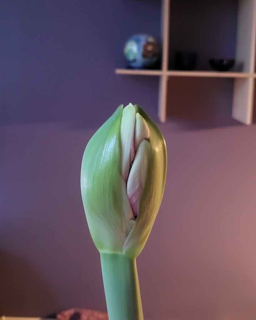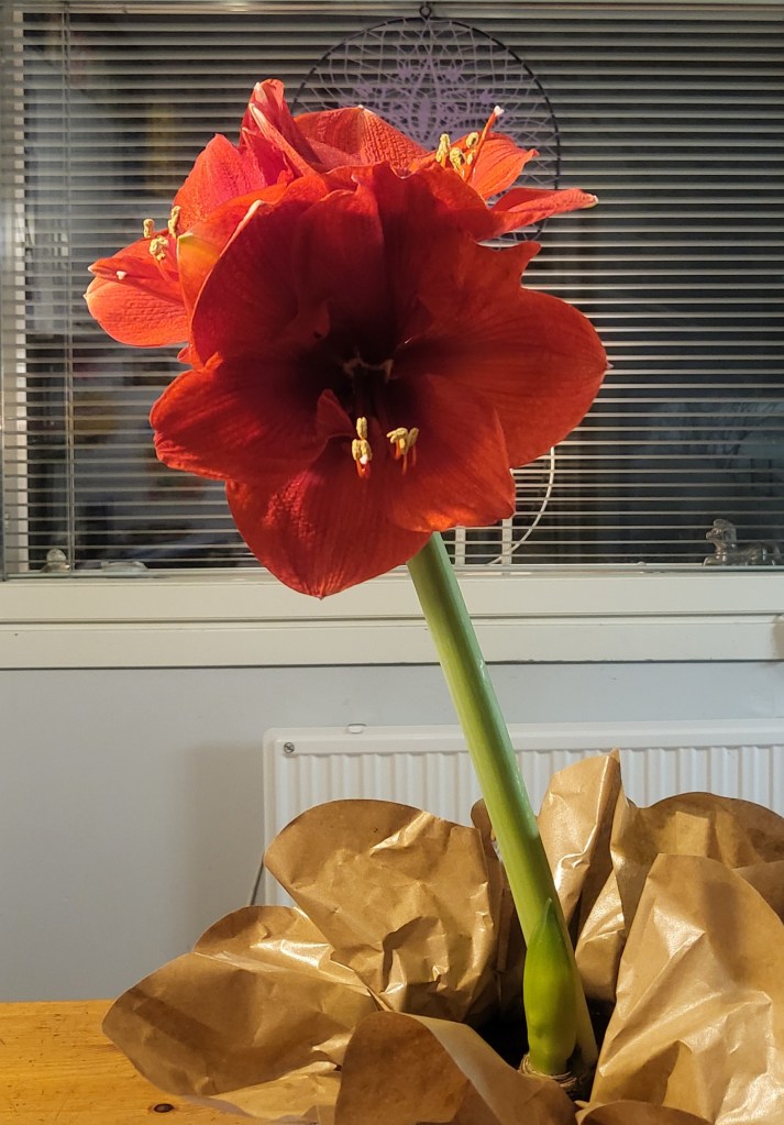 Hämmästelin muuten elämäänsä kyllästyneen amarylliksen kukkien kokoa. Nehän on reilusti isompia kuin kämmen, halkarisija parikymmentä senttiä eli aivan valtavia! Vain kolme kukkaa tuossa varressa on, mutta ilmeisesti niiden koon takia nuppukin oli älyttömän kokoinen. Olkkarin vanha-amarylliskin alkaa vähitellen raotella suojalehtiä nupun päältä, joten eiköhän sekin ensi viikolla jo ole auki.