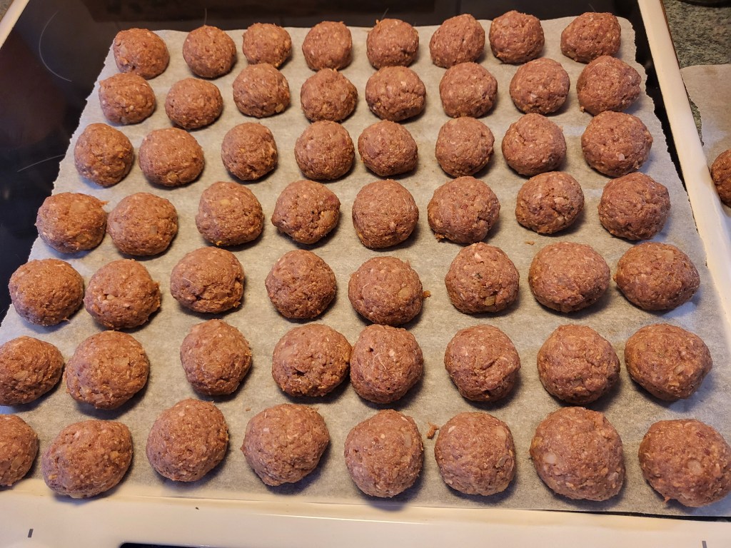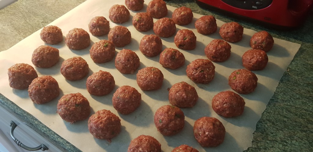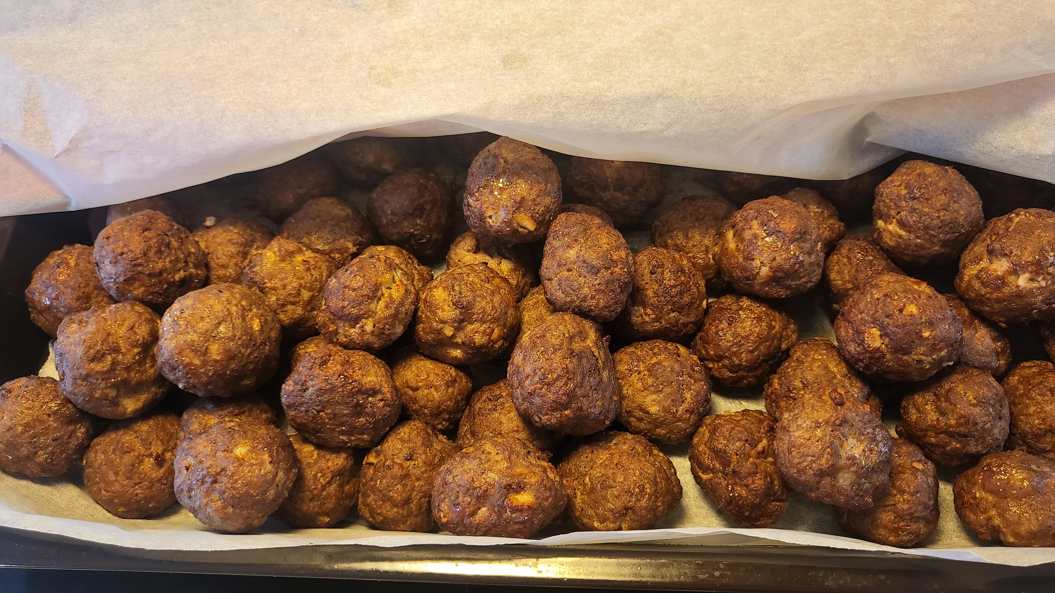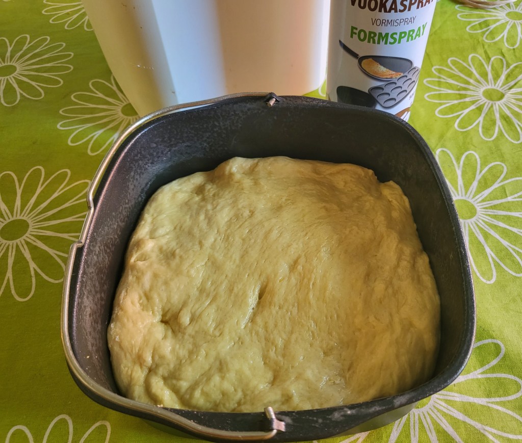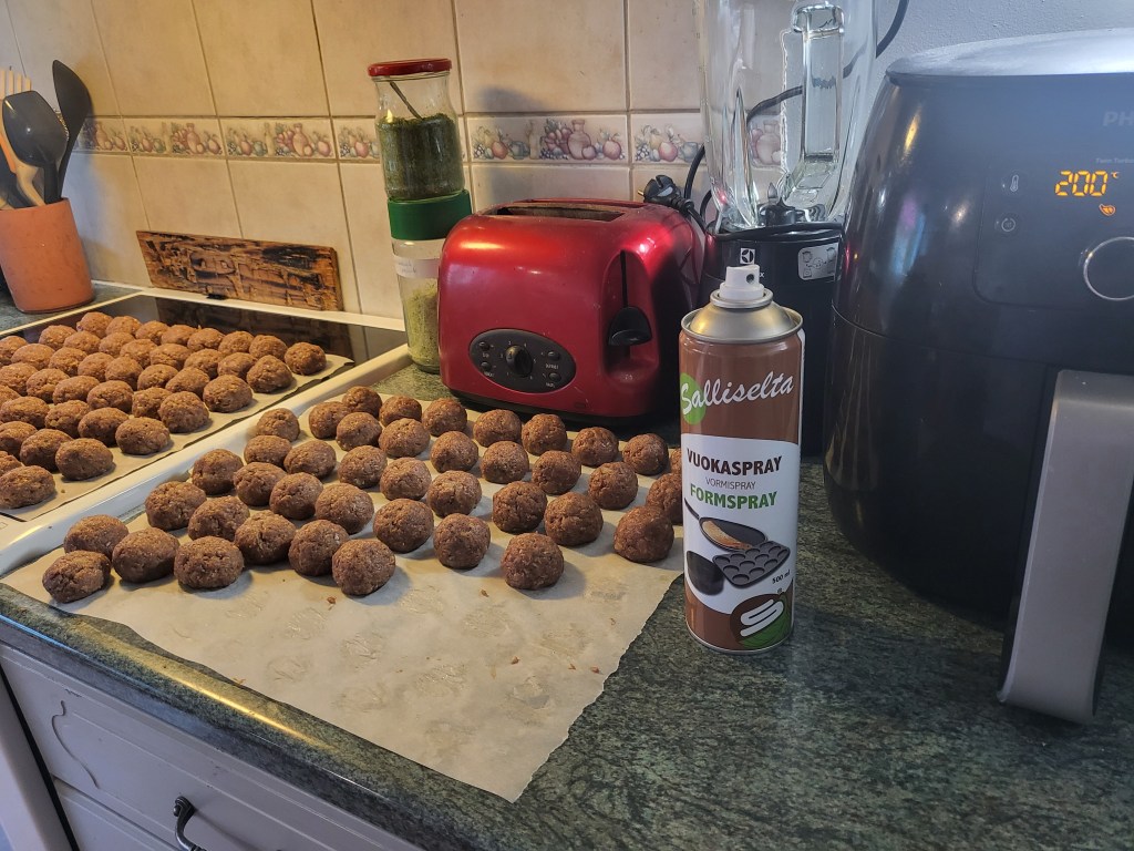 Kun taikina on ehtinyt tasaantua päästäänkin siihen hassunhauskaan osioon eli pyörittelyyn. Tästä määrästä taikina tuli pyöriteltyä 112 ihan kunnon kokoista pyörykkää. Pyörykät paistoin airfryerissa 200 asteessa 9 min, ennen ensimmäistä satsia suihkaisin Sallisen vuokasprayta fryerin koriin. Paiston puolessa välissä ravistelin koria niin, että pyörykät olivat varmasti irrallaan toisistaan ja saivat tasaisesti väriä.