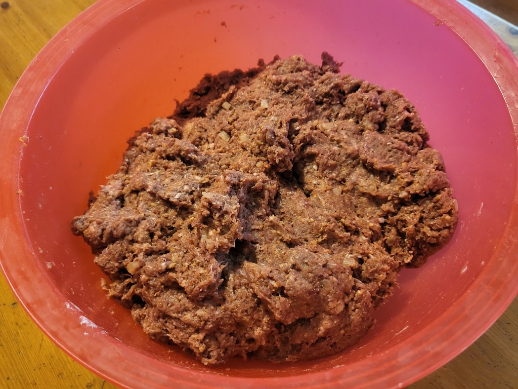 Lihamassan valmistus alkoi mausteilla, eli aluksi laitoin isoon astiaan korppujauhot, nesteet ja mausteet ja annoin niiden seisoa siellä sen hetken, että korppujauhot turposi hyvin. Tämän jälkeen lisäsin jauhelihat, kananmunat ja perunajauhoja ja sekoitin massan kunnolla tasaiseksi. Toki siinä piti sitten paistaa se testipihvikin, ennen kuin massa päätyi jääkaappiin makuja tasaamaan.