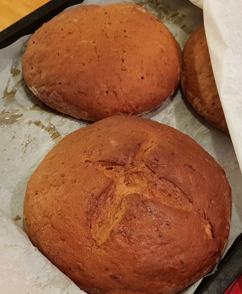 Pari litran taikinaa tuli tehtyä, loppusaldona oli kuusi limppua. Kolme niistä päätyi joulukukkasiksi, yhdestä limpusta nuorimmainen söi aamupalana puolet. Joulukukkien väsääminenhän aiheutti tietysti sen, että aamupäivästä ajelin vielä kesken puuhien pitkin kyliä viemässä niitä limppuja saajilleen, joten riistasoosin teko jäi myöhempään.