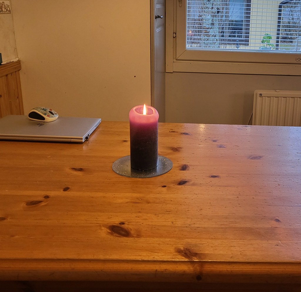 Välillä fiilistely on enemmän kuin paikallaan. Kuten sellaisina päivinä, jolloin töistä pääsee hyvissä ajoin ja fiilis kotiutuessa on loistava. Niin loistava, että kun alkaa keittiössä touhuamaan huomaa töistä hihaan tarttuneen hyvän mielen tarran päätyneen työtasolle perunakattilan viereen. Pakkohan moisen hyvän tuulen on jatkua perunoiden kuorinnan ja keittiön tasojen siivoilunkin ajan, jopa siinä määrin, että on pakko laitella kynttilä fiilistelyn määrää lisäämään.