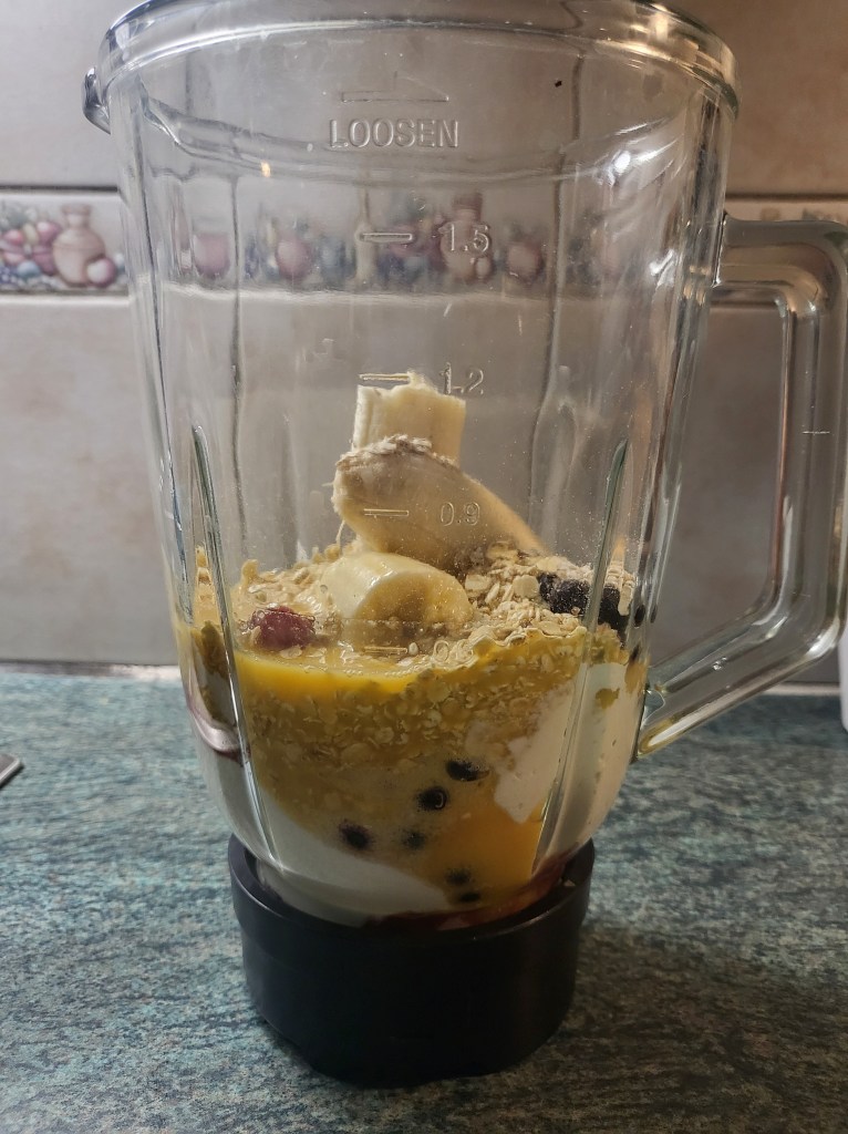 Iltasella voi sitten epätoivoisesti yrittää pienentää sitä smoothiemääräänsä, se määrä kun tuli tavaksi kun poika oli vielä kotosalla. Poika kun joi myös iltapalansa lisukkeeksi lasillisen smoothieta ja nyt on tuntunut, että itse on pitänyt kiskoa sitä liki kaksin käsin aamupalana kun sitä vain tulee ihan älytön määrä sillä omalla vakiosatsilla. Melko lähelle oikeaa määrää osuttiin pienentämällä jogurtin määrää yhdellä ruokalusikallisella, kaurahiutalemäärää puolella desillä ja marjojen ja mehunkin määrää himppasen.