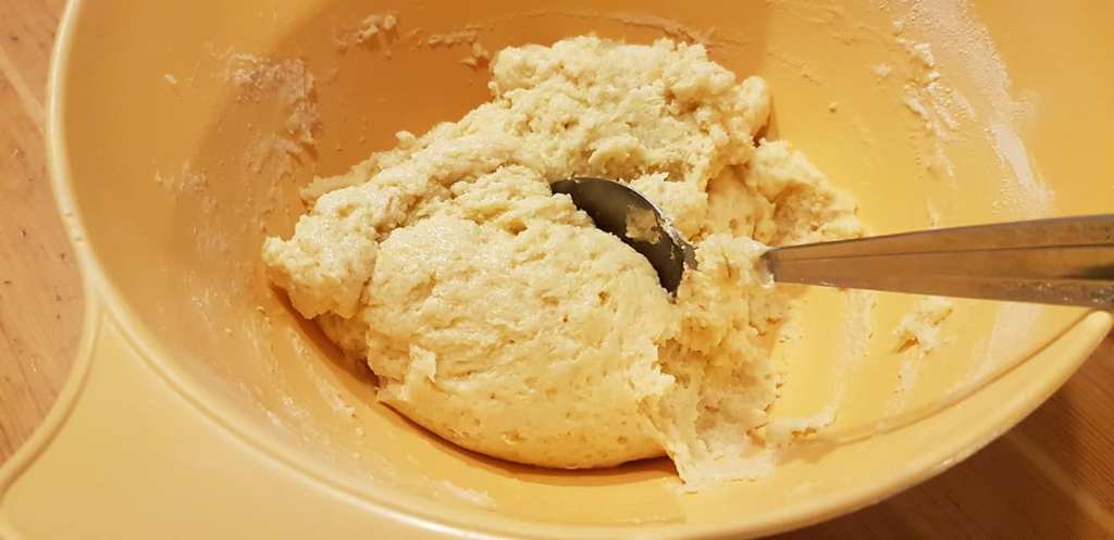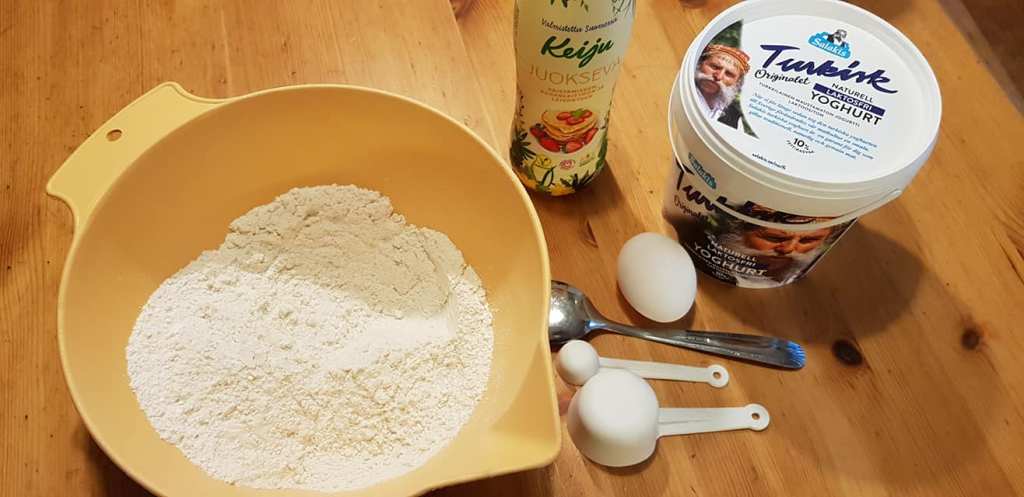Sekoittelin ensin kuivat aineet keskenään kulhossa, sen jälkeen lisäsin kananmunan sekä muut aineet joukkoon ja sekoitin taikinan lusikalla tasaiseksi.