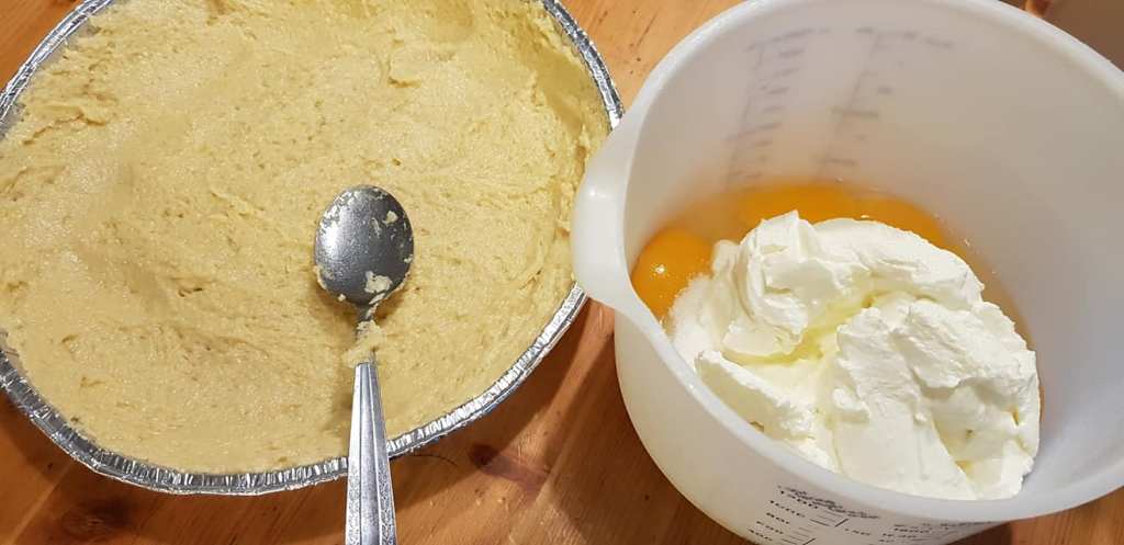 Kippasin taikinan vuokaan ja tasoittelin lusikalla, nostin hieman reunojakin ylös ja hyvinhän tuo kävi. Sen jälkeen tein täytteen.
