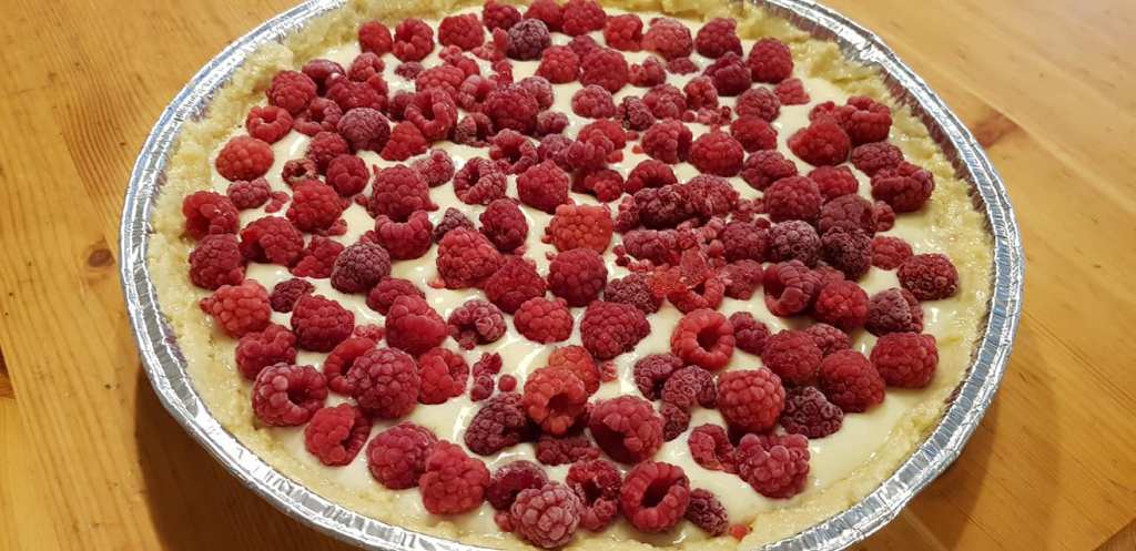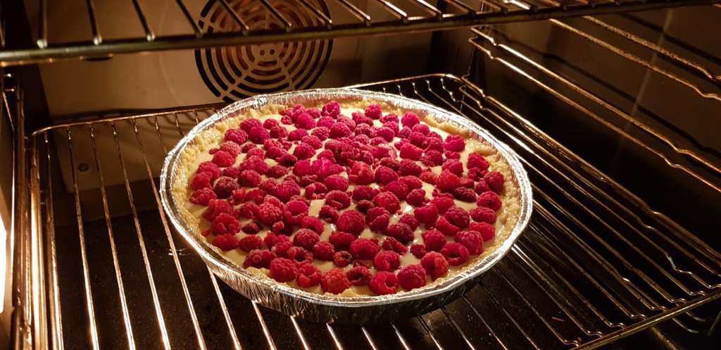 Täytteenkin sekoittelin tasaiseksi lusikalla. Yleensä olen laittanut marjat suoraan pohjan päälle ja vasta sitten kaatanut täytteen päälle, nyt tein tämän toisinpäin. Eli ensin täyte piirakkapohjan päälle ja päälle ripottelin puolisen litraa vadelmia.