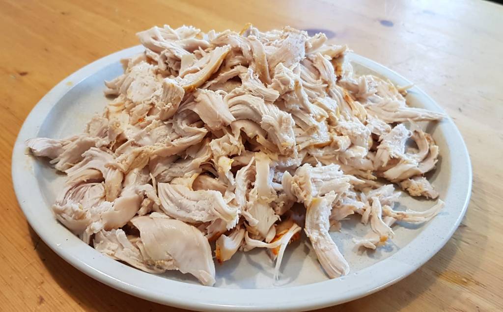 Broilerin luulliset rintaleikkeet, kypsennä uunissa 200 asteessa n. tunnin ajan. Anna jäähtyä ja riivi suikaleiksi.