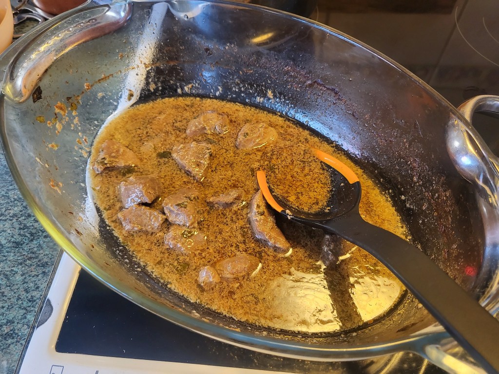 Siinähän sitä. Hirvipaistia. Joukkoon meni myös pala villisian paistia, ja tottahan sinne piti laittaa porkkanaa ja sipuliakin. Mausteina tässä toimii vain ja ainoastaan suola, rosmariini, valkosipuli, maustepippurit ja laakerinlehdet. Ai niin, ja toki sekaan päätyi tölkki joulukalenterista tullutta Amberia. Maku aikas bueno.