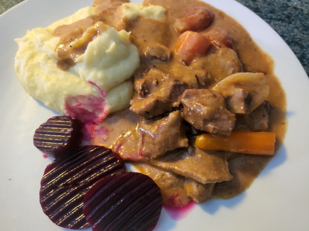 Aivan mahtavan hyvä ruoka, kylkeen vielä perunamuusia ja punajuuriviipaleita ja johan vatsa kiitti!