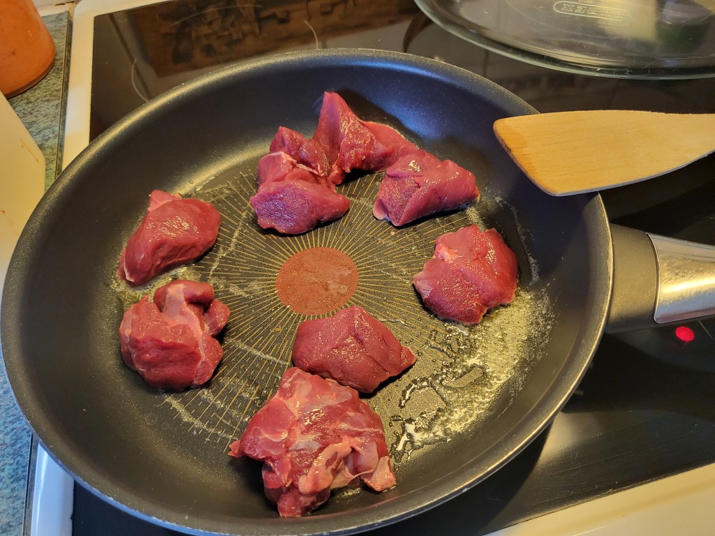 Aikani tuumittua mitä siitä lähtisin tekemään päädyin soveltamaan stroganoffin ohjetta. Lopulta sapuska muotoutui pitkälti pyöräyttäen paistipalat pannulla ja ripottamalla jauhoja pannulla niiden päälle ennen uunivuokaan asettelua. Tässäpä ohje moiseen sapuskaan.
