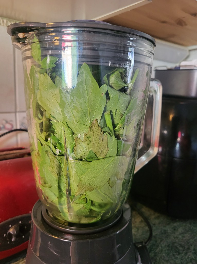 Lopulta sitä lipstikkarouhetta oli vähän siellä sun täällä, sillä päädyin irrottamaan blenderin astian useampaan kertaan ja avittamaan rouhintaa leikkaamalla saksilla yrttejä. Sitkeys palkitaan ja niin vain minulla oli kuin olikin suht hyvin rouhittua yrttisilppua. Silppua oli kaikkineen puolisen litraa kulhossa ja päädyin yhdistämään useamman sivuston kautta saamani vinkit.