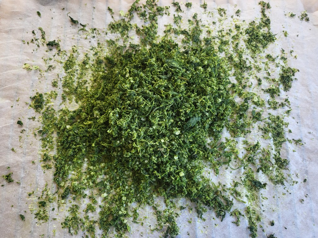 Himoleipurin ohjeistuksen mukaisesti jatkoin touhua, eli silppu pellille, uuniin kiertoilmalla lämpötilaksi noin 30 astetta ja ei kuin muihin puuhiin. Kävin useampaan kertaan sekoittelemassa silppua ja kas. Viisi tuntia myöhemmin totesin sen kokolailla kuivaksi. Annoin sen levähtää vielä pellillä parin tunnin ajan, levähdyspaikaksi valikoitui lievästi kuumahko kuisti.