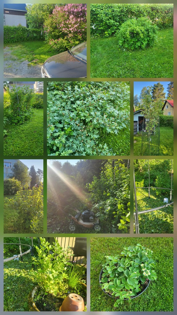 Mustaherukkaa on luvassa, raparperisadosta on korjattu jo ensimmäinen ja lisää tulee. Trampan alustakin tuli tyhjennettyä rikkakasveista ja se jos joku oli urakka. Valkoherukoille tuli tehtyä samalla tilaa. Näytti melkein siltä, että piha ”kasvoi”, sillä vaikka kuinka ihastuttavaa vehreys onkin niin silti se vie näkijältään aluetta.