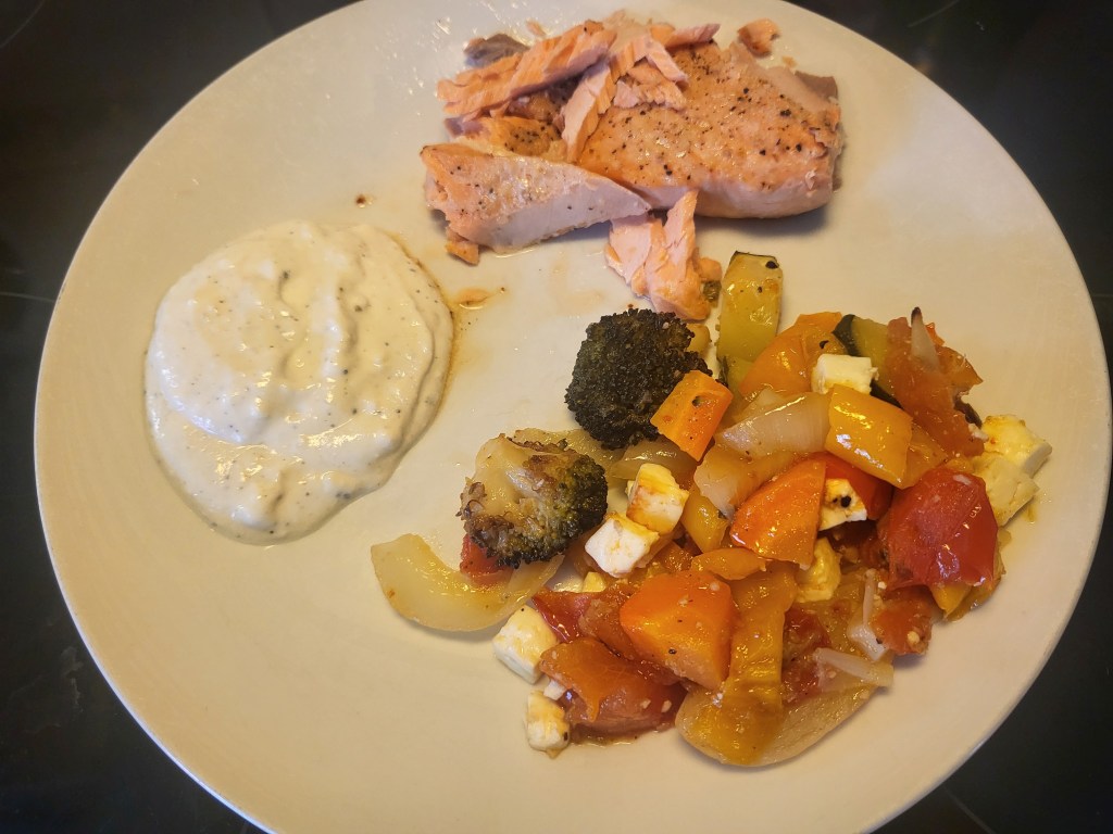 Kasviksetkaan ei kummoista työtä kaipaa, pilkkomisen vaiva taitaa olla isoin homma. Tällä kertaa uuniin päätyi parsaa, kesäkurpitsaa, tomaattia, sipulia, paprikaa ja porkkanaa. Mausteiksi kasviksille riittää oliiviöljy, suola, valkosipuli ja vinegrette. Lisäksi heitin päälle fetakuutioita paiston puolivälissä.