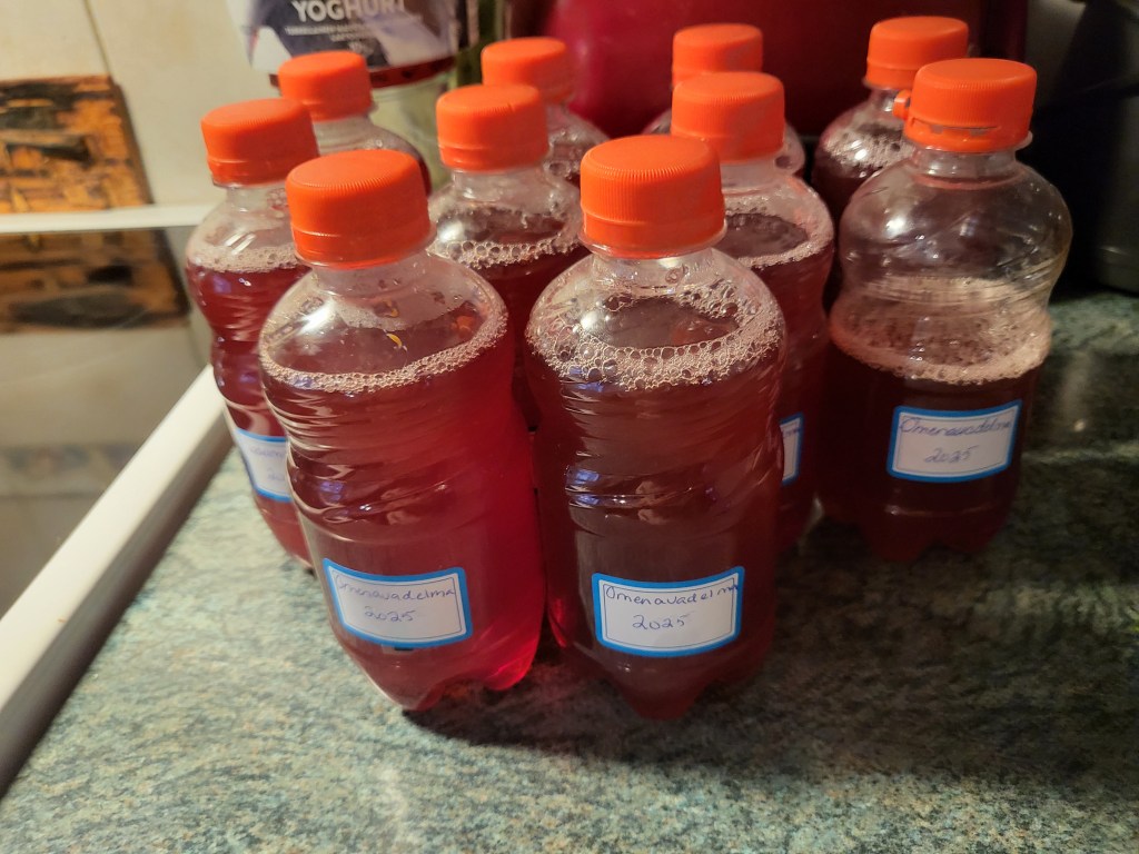 Oman maan tuotoksien käyttö, jos joku, on taloudellista ja terveellistä puuhaa. Ja sitä ekologista touhuakin vielä, minä kun säilön mehut aina pakastimessa muovisissa limpparipulloissa. Tänään maijassa lähti porisemaan satsi kolme, pari satsia on pakkaseen jo ehtinyt eli kohtahan siellä on jo parikymmentä litraa juotavaa. Ja marjojen keittelyä en ole vielä edes aloittanut, ne on pakkasessa odottamassa omaa vuoroaan.