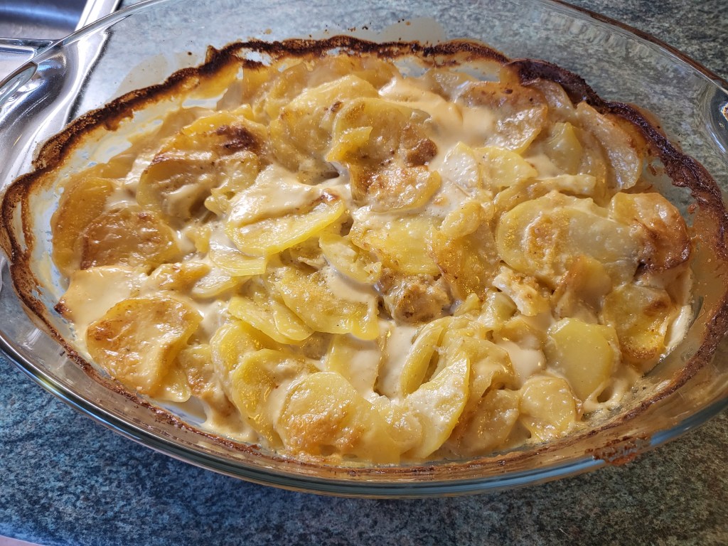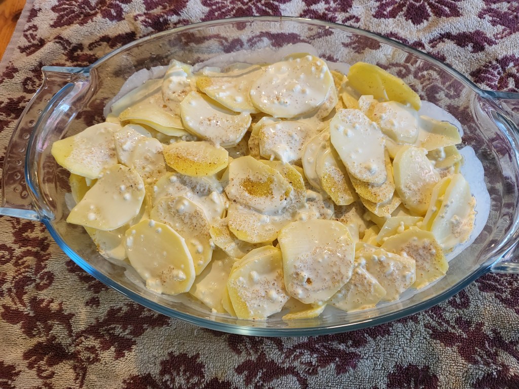 Samalla kaavalla jatkoin kunnes kaikki perunat oli sievästi ladottuna vuokaan. Sekoitin keskenään kerman, ranskankerman, valkosipulituorejuuston ja suolan ja kippasin koko komeuden päälle.