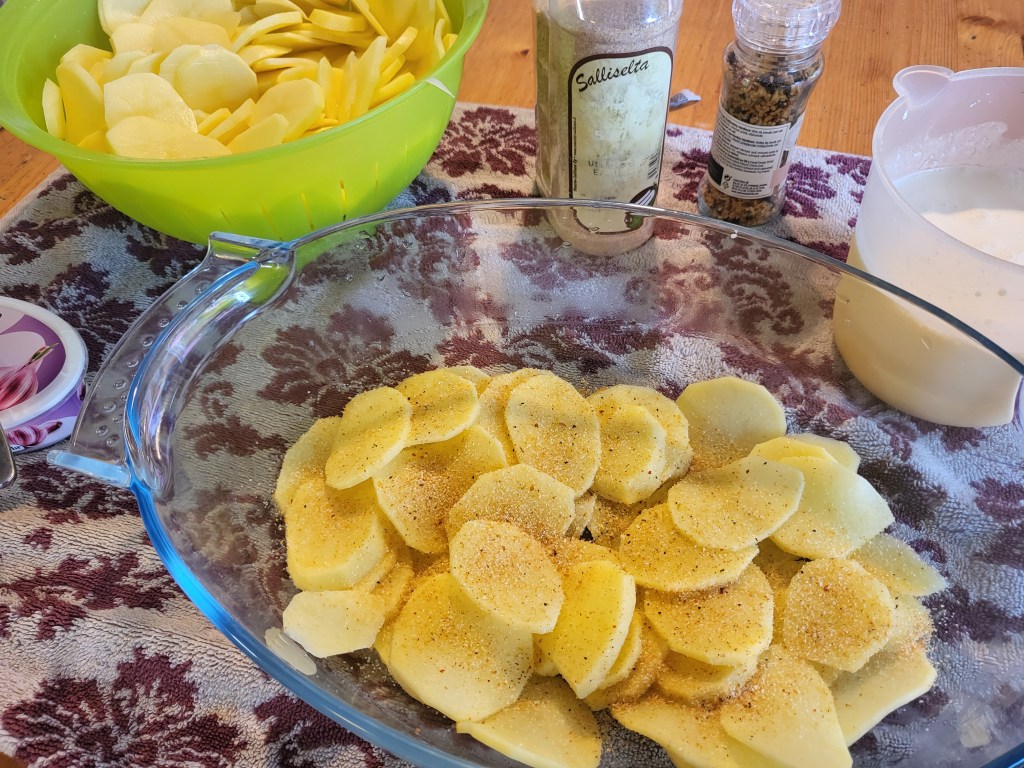 Liotin perunoita hetken vedessä ja kippasin ne sitten siivilään, huuhtelin vielä isoimmat tärkkelykset pois. Ladoin uunivuokaan kerroksen perunaa, päälle runsaasti valkosipulijauhetta, useampi pyöräytys Santa Marian-myllystä ja muutama pyöräytys Himalajan suola-myllystä.