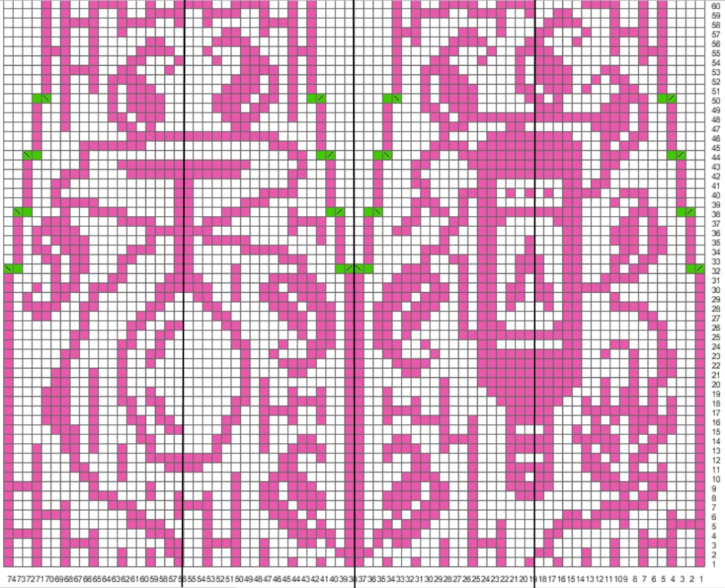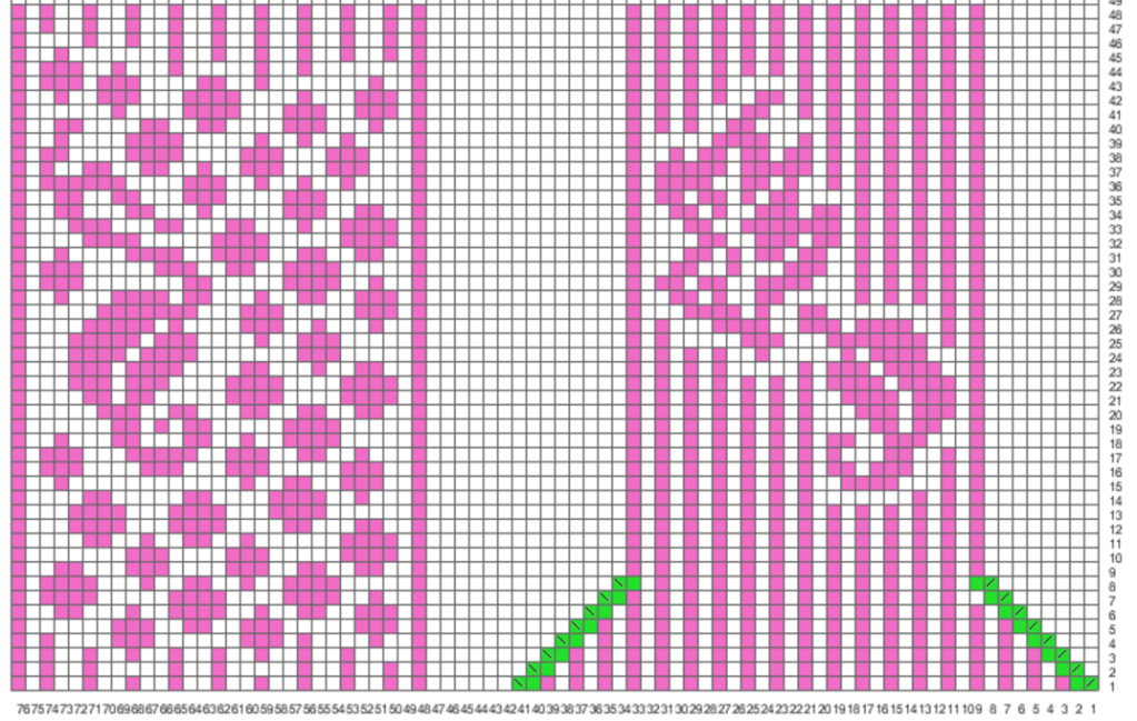 Tein kiilakavennukset joka kerroksella kunnes työssä oli yhteensä 56 silmukkaa. Sen jälkeen jatkoin kärkiosan kutomista kunnes pituus oli itselleni mieluinen ja ryhdyin silmukoimaan kärkeen heppoja. Heppakuvion leveys on 23 silmukkaa ja korkeus 28 kerrosta.