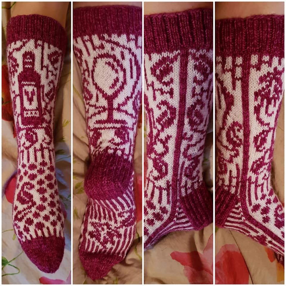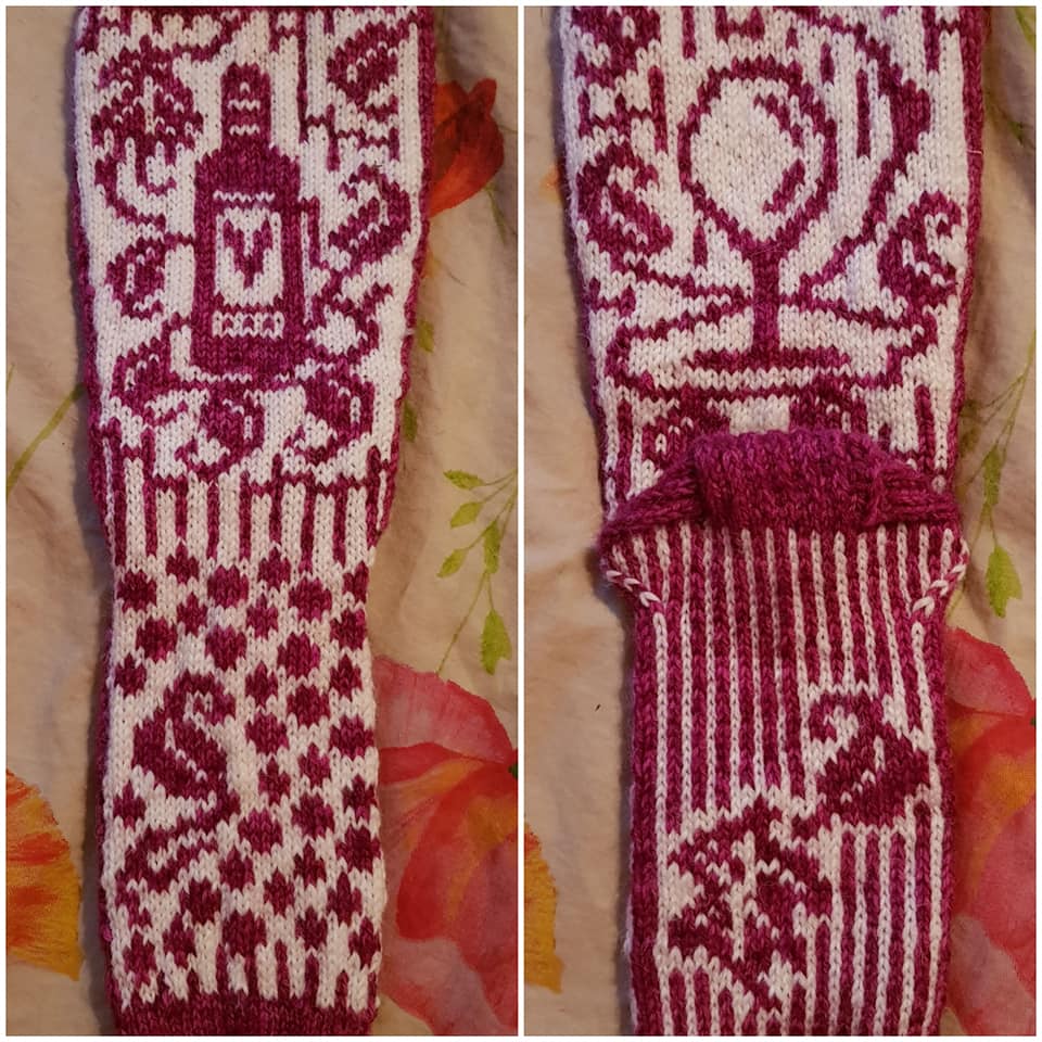 Lankana 7-veljestä, kuvio silmukoitu päälle. Kuvion löysin Pinterestistä, taisin käyttää hakuna ihan simppelisti hakusanaa ”jallusukat”. Tai ehkä Jaloviina. No, oli miten oli. Tulipa tehtyä.