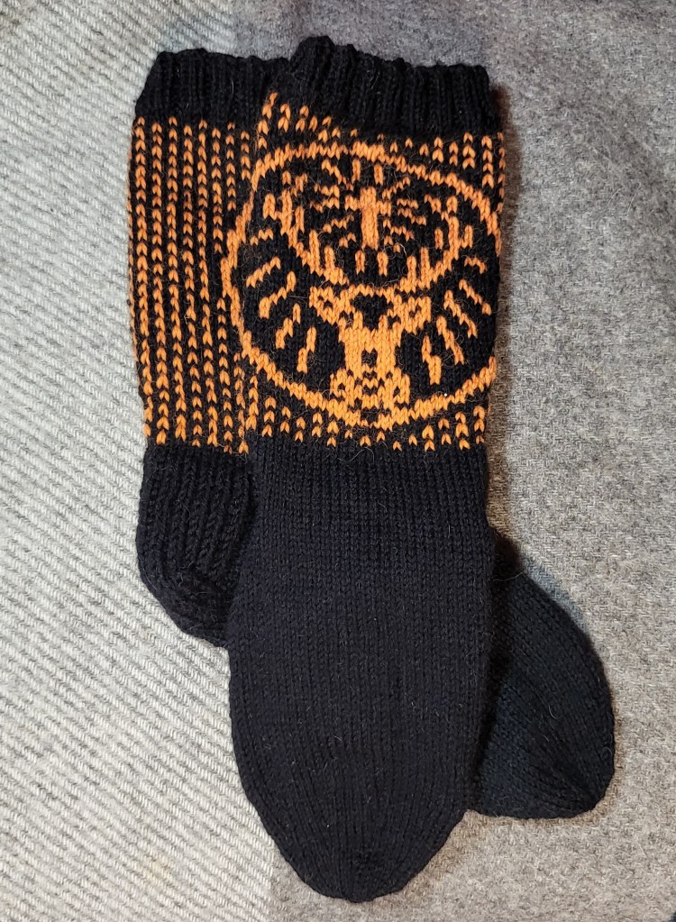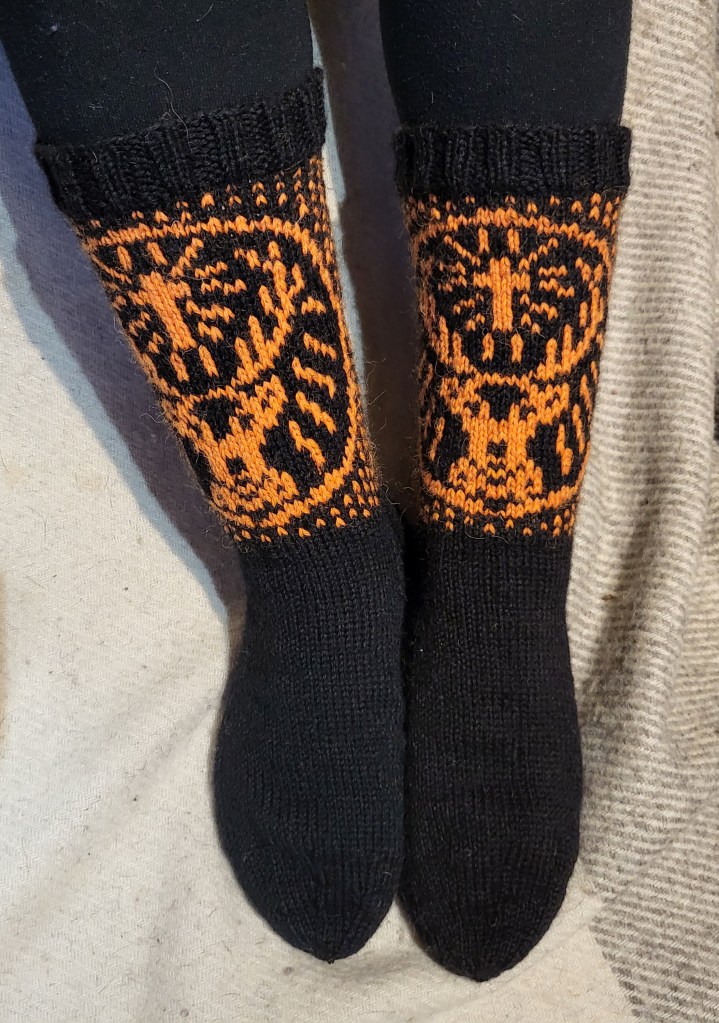 Lopulta päädyin tekemään kärjet simppelisti mustina. Kudoin kaikkiaan 50 kerrosta kantalapun jälkeen, jolloin kärjen kokonaispituudeksi kavennusten kanssa tuli 25 senttiä. Kärkikavennukset tein sädekavennuksena, päättelin langat hyvin ja kas, blokin päällä muotouduttuaan sukat oli valmiit.