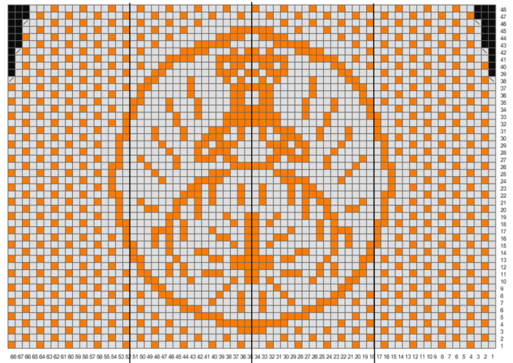 Silmukkalisäyskerroksen jälkeen kudoin mallikaavion mukaisesti kuviointia. Päädyin tekemään raitaosaa hieman pidemmän matkan alaspäin kuin kaaviossa on, pituutta kun sai olla enemmän. Raitaosan valmistuttua jatkoin pelkällä oranssilla kahden kerroksen ajan, toisella kerroksella kavensin joka kymmenennen ja yhdennentoista silmukan yhteen 66 -> 60 silmukkaa.