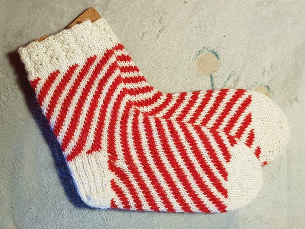 Odotimme kieli pitkällä ensimmäistä ohjeen osaa ja kumpainenkin laittoi puikot sauhuamaan sen saatuaan. Alku vaikuttikin lupaavalta, aivan erityisesti ihastutti sukkien joustin. Karkkiraita pisti jo hieman miettimään, mutta mikäs. Ihan suht ok, totesimme yhteen ääneen.