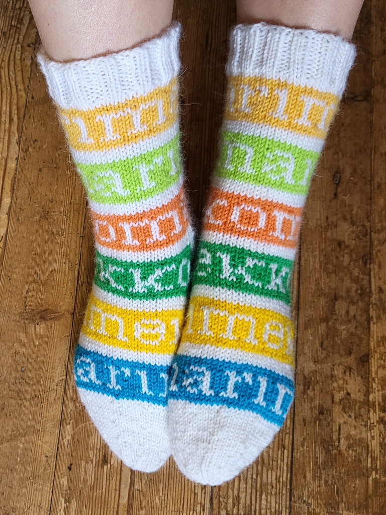 Nämä on ihan perussukat, aloituksessa oli vain 48 silmukkaa ja silti näistä tuli mielestäni juuri sopivan kokoiset ja jalkaan vetäessä kiristämättömät. Lanka oli todella mukavaa käsitellä ja sukkien tekokin kävi joutuisasti. Toivottavasti lahjan saaja näistä ilahtuu.