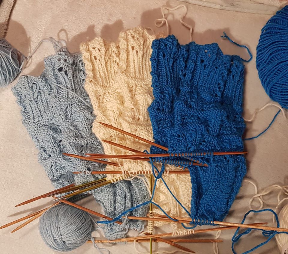 Näistä tuli kokoa 39, varrella on pituutta reilut 45 senttiä. Lankana näissä on valkoinen seiskaveikka ja puikot on 3,5 mm koivupuikot. Alkuun tein jälleen nauhakujan ja koska nämä ylettyvät helposti polvitaipeen yli päätin laittaa joustinpitsiä yläosaan.