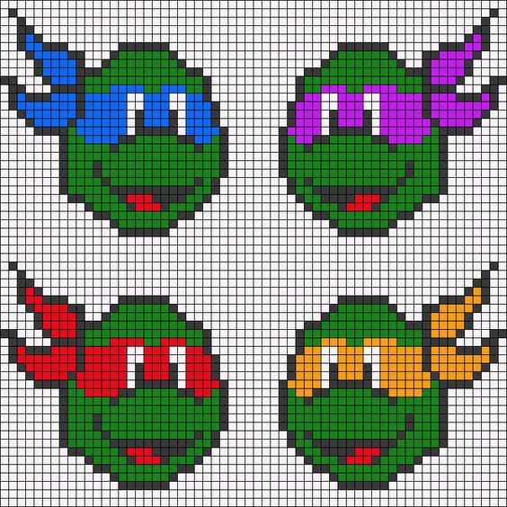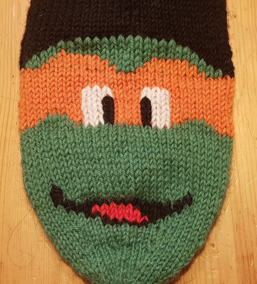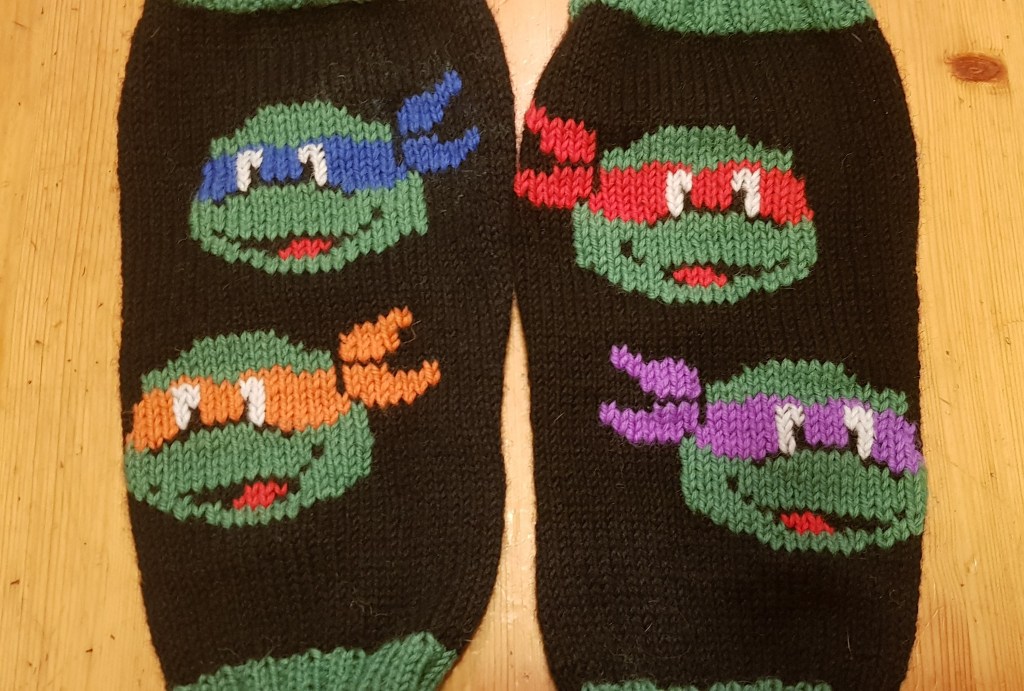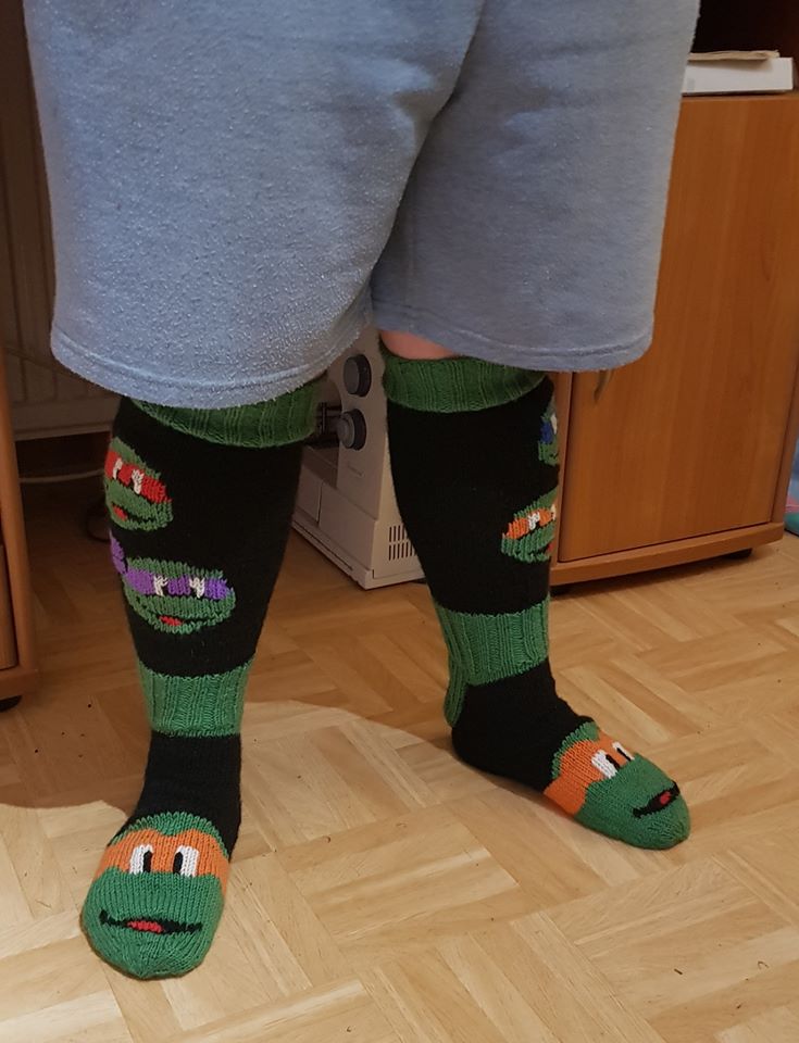 Niinhän siinä kävi, että minulta toivottiin teenagemutantninjaturtles (sanahirviö!!!)-sukkia. Muutaman ajan ideaa hauduttelin sillä ohjeita moisiin ei tietenkään ottanut löytyäkseen tuosta vaan. Lisätoiveetkin hieman aiheutti mietintää, isokokoiselle miehelle ja jalankoko 47. Hmmm… Ja ei, ne ei saa olla lörpät eikä liian kireätkään. Vähin erin idea sitten kirkastui itsellekin ja pitkällisen netin pelmailun perään löysin kuin löysinkin muutaman kuvan joita hyödyntää suunnittelussa. Ja tässä ne nyt sitten on. Mutantit.