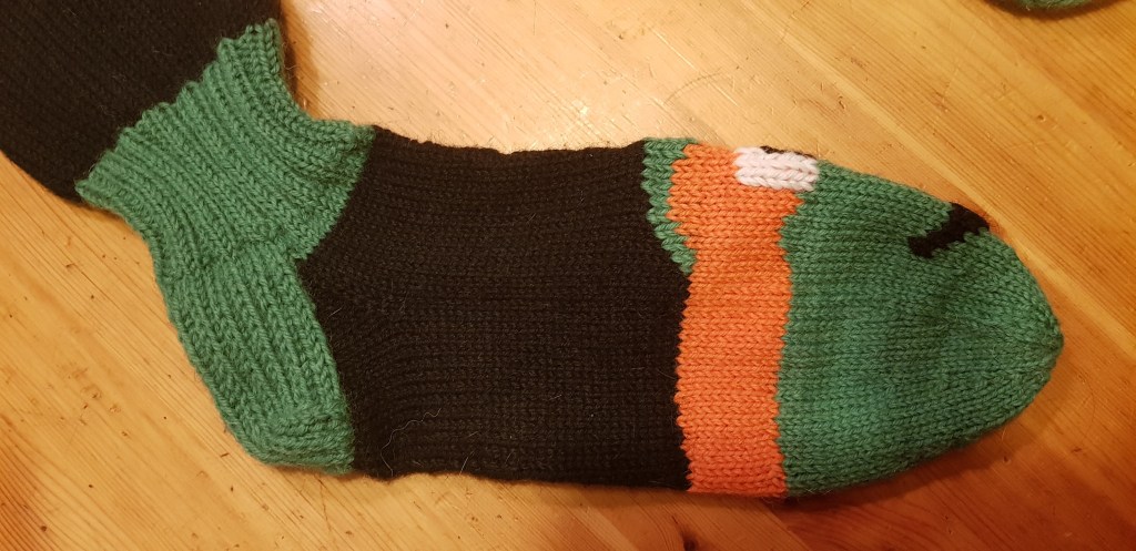 Kun kantapohjan kavennukset on tehty poimi sivuista silmukat vielä vihreällä ja vaihda lanka tämän jälkeen mustaan. Kudo kiilakavennukset tottumallasi tavalla ja kun jalkapohjan mitta on omasta mielestäsi sopiva vaihda lanka oranssiin. Itsellä tuli kantalapun jälkeen 41 krs mustalla ja sen jälkeen oranssilla 11 kerrosta.