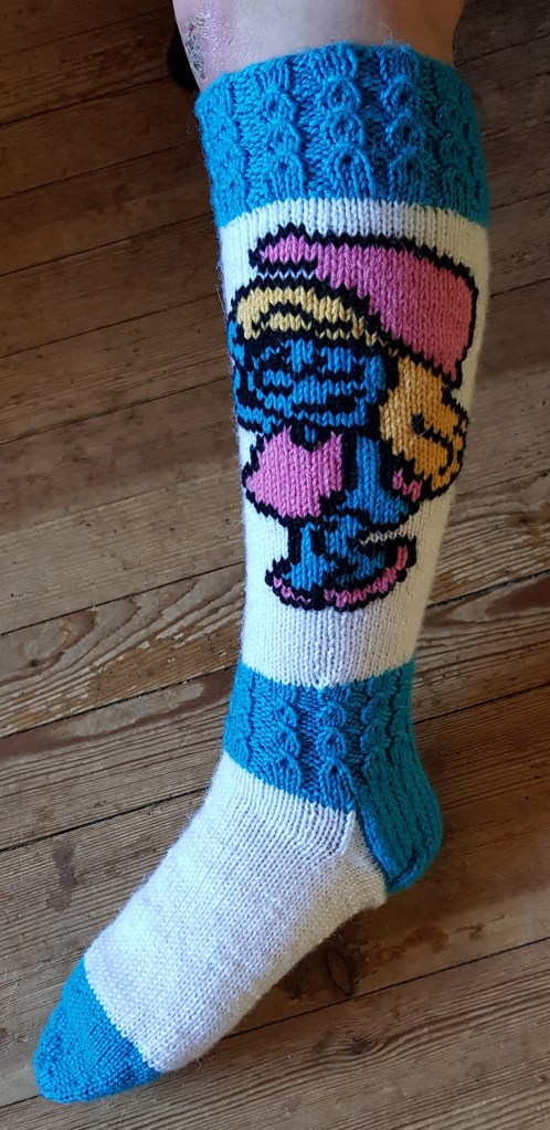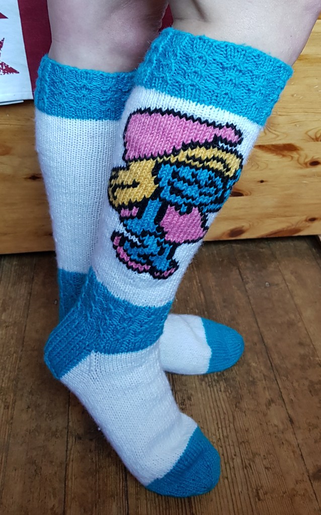 Päädyinpä sitten tekemään pitkät sukat Pikkymyy-hahmolla. Hahmon kaaviohan löytyy netistä, mm Pinterestistä. Muokkailin kaaviota sen verran, että sain pilkut asettumaan kivasti paikoilleen. Pitkien langanjuoksujen sitominen kun on aikamoista myrkkyä.