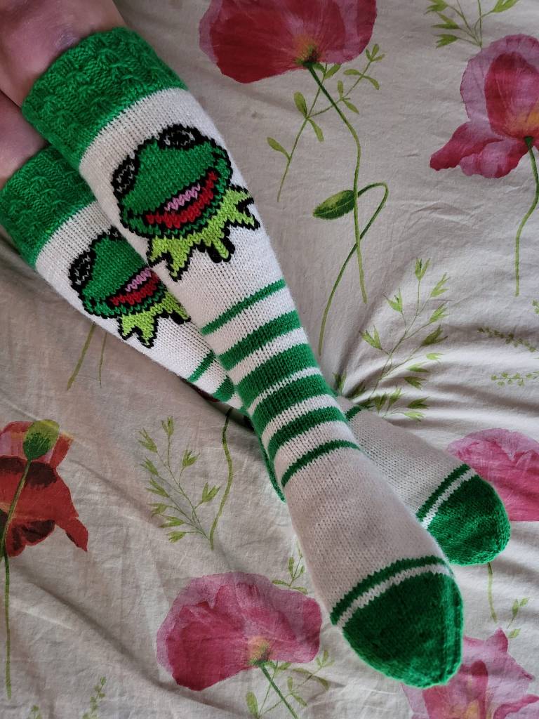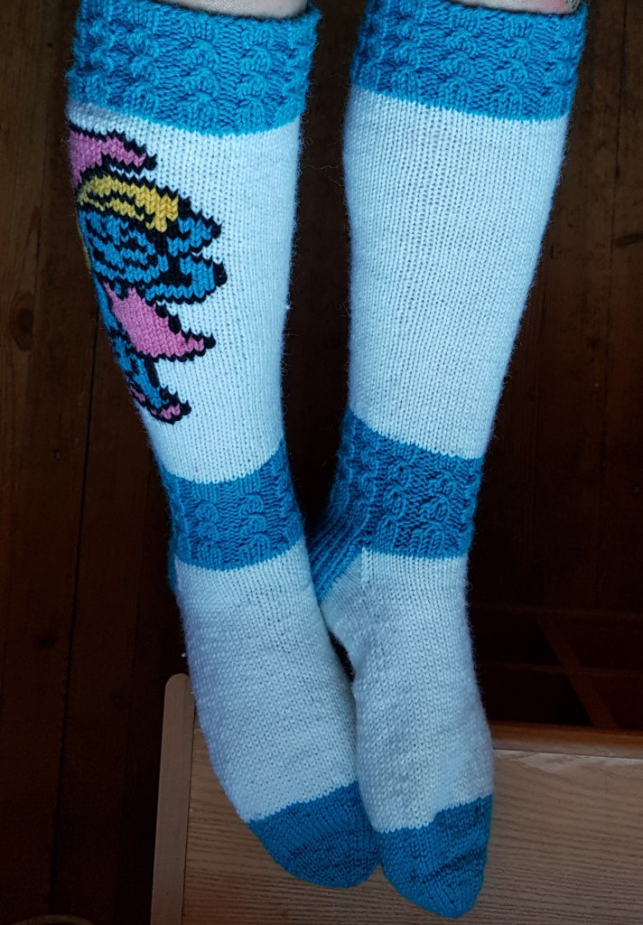 Olihan siinä silmukoitavaa, mutta hauskat tuli! Näiden varsinainen sukkaosa on tehty Hoitsukat-sukkien silmukkamäärillä ja kavennuksilla, malli kuvaan löytyi Pinterestistä. Seiskaveikasta.