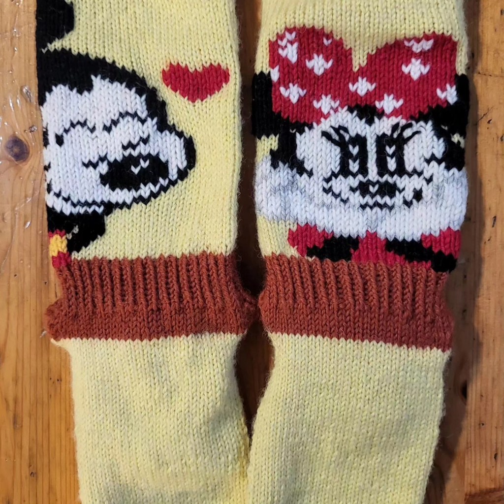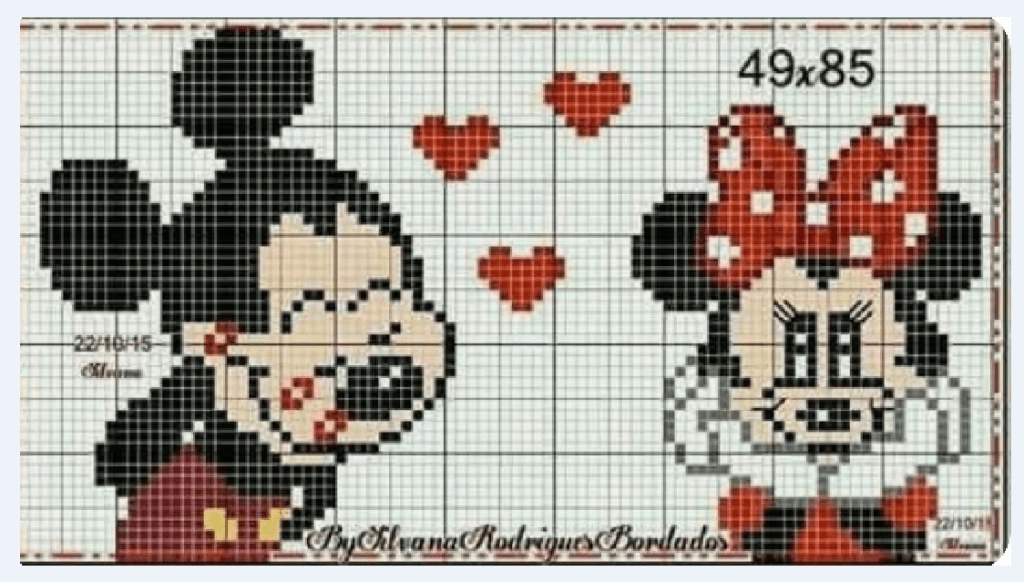 Aika suklaisethan nämä värit omaan silmään on, mutta jotenkin päädyin kuitenkin Mikkiin ja Minniin, niiden kohdalla kun osui Pinterestistä todella kiva ristipistokuvio silmiin. Kuvion on tehnyt Silvana Rodrigues Bordados ja ajatuksena on ollut kirjailla nämä samalle pohjalle, mutta minäpä otin ja nakkasin Minnin toiseen sukkaan ja Mikin rakastuneena hempeilemään Minniä kohti.