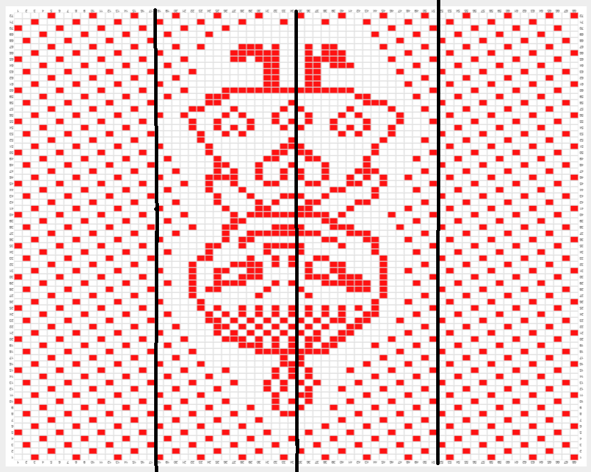Palkkien jälkeen kudoin 4 kerrosta valkoisella, jonka jälkeen aloitetin lakupekkakuvioinnin. Lakupekkojen suut jätin kutomatta, ne silmukoin punaisella sukkien valmistuttua. Kuvio on 16 silmukalla jaollinen, lakupekkaan menee 15 silmukkaa ja jokaisen lakupekan väliin jää yksi valkoinen silmukka.