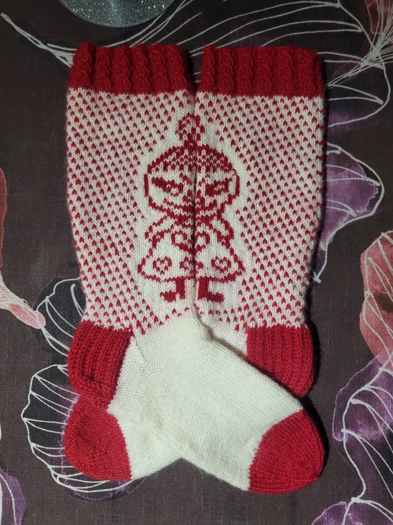 Mustien palkkien korkeudeksi tuli jälleen 8 kerrosta ja jalkapöydän päälle tein vielä kuvioinnin kaavion riveiltä 2-6. Ennen kärkikavennuksia tein vielä kaavion kerrokset 7-11 ylhäältä alas ja palkeille korkeutta 8 kerrosta. Kärkeen tuli sädekavennus ja viimeiseksi silmukoin vielä hahmoille suut paikoilleen.