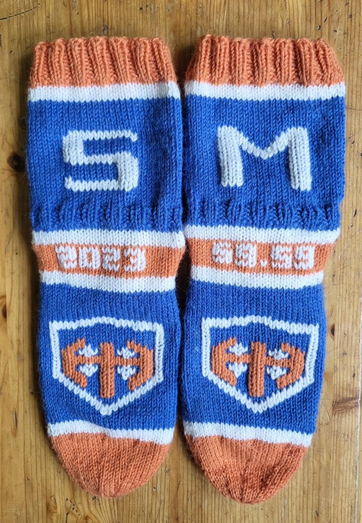 Ipa-fanille voisi vielä silmukoida nimenkin nilkan mustaan osaan, mutta katsotaan nyt kuka se fani on jolle nämä päätyvät…