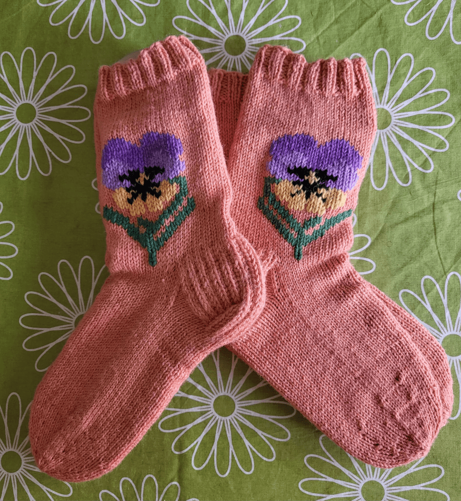 Minkäs sille rakkaudelle voi. Nämä sukat oli hieman sellaiset ”jos nyt vähän jotain kutoisi”, joten päädyin kutomaan ihan perussukkaa ilman sen kummempia krumeluureja. Kutoa kun voi silloinkin, kun pitää kuunnella ja keskittyä esim kokouksessa. Vasta näiden valmistuttua aloin miettiä, että pitäisikö kuitenkin silmukoida varteen joku kuva.