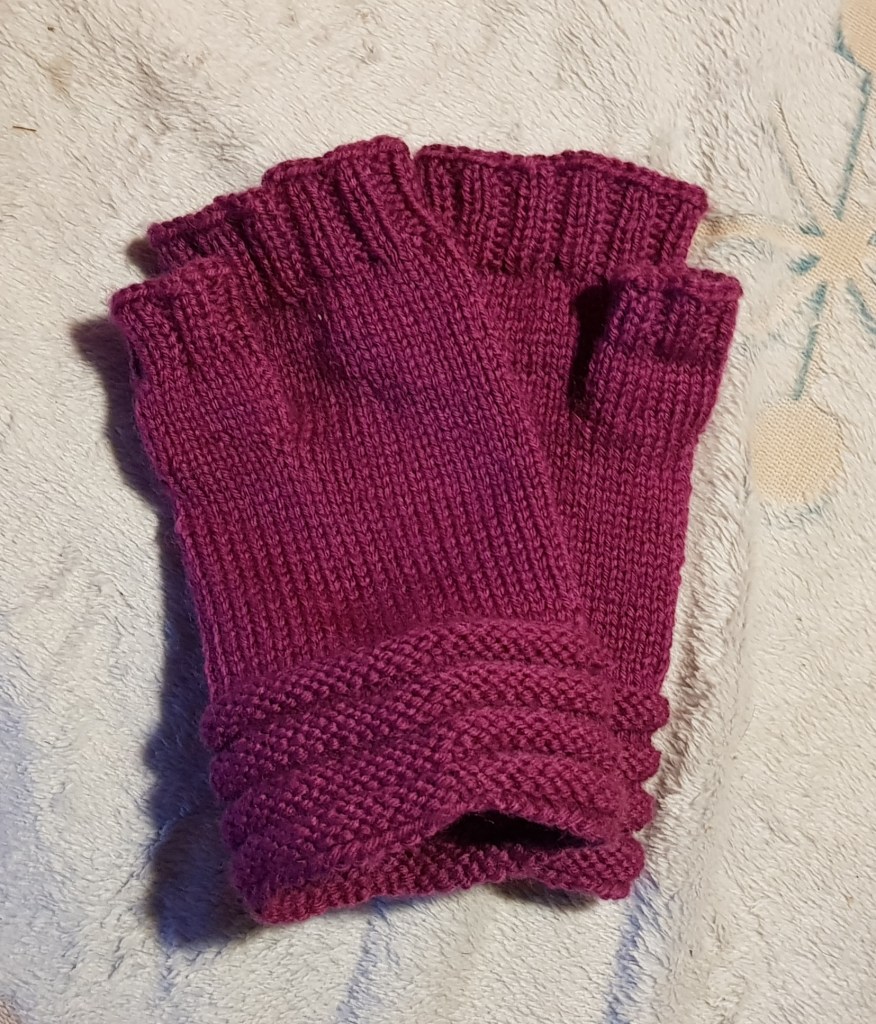 Tämän jälkeen lähdin tekemään peukaloita, poimin apulangalla olevat silmukat 7+7 puikoille ja nostin kummastakin sivusta vielä 3 silmukkaa (yhteensä 6) lisää työhön. Kudoin näillä 20 silmukalla 10 kerrosta oikeaa ja sen jälkeen 2 oikein, 2 nurin-joustinta 6 kerrosta. Päättelin jälleen löysähkösti.