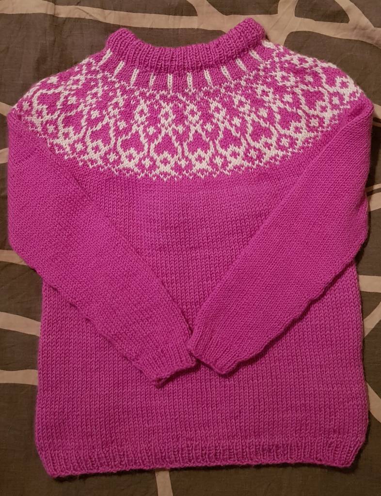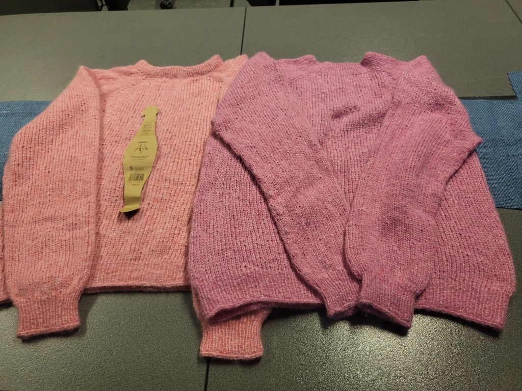 Seuraavat kaksi paitaa tein juuri niillä ekoilla LindeHobbysta tilatuilla langoilla eli kakkoskuvassa näkyy mansikkajäätelö-väri (unicolour 53) ja ruusunlehti-väri (unicolour 52). Tällä hetkellä puikoilla keikkuu vuorostaan sievä orkidea-väri (mix 41) ja vielä on jäljellä vaalea roosa-kerät (mix 08). Niiden paitojen valmistuttua taidan pitää taukoa, vaikka myönnettävä se on. Tämä kyseinen malli on aivan ihanan helppo kutoa ja mainio päällä.