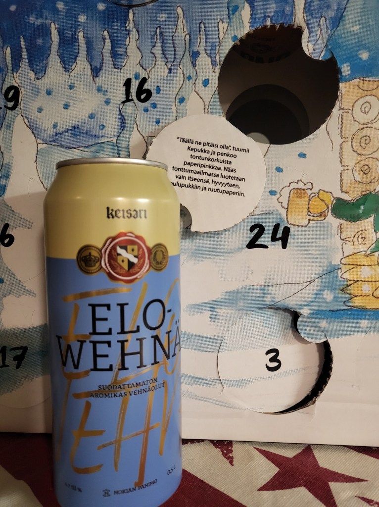 Tällä kertaa kalenterista putkahti Keisarin Lager-olut, lieneekö kyseessä kehittyneempi versio eilisestä Micro Lagerista. Sekin päätyi toki sinne jääkaappiin, saapa nähdä saako niitä sieltä juotua. Minä kun en ole mikään erikoisolueiden ystävä, eikä sitä ole sen paremmin puolisokaan. No, aikansa kutakin, sanoi pässi kun päätä leikattiin.