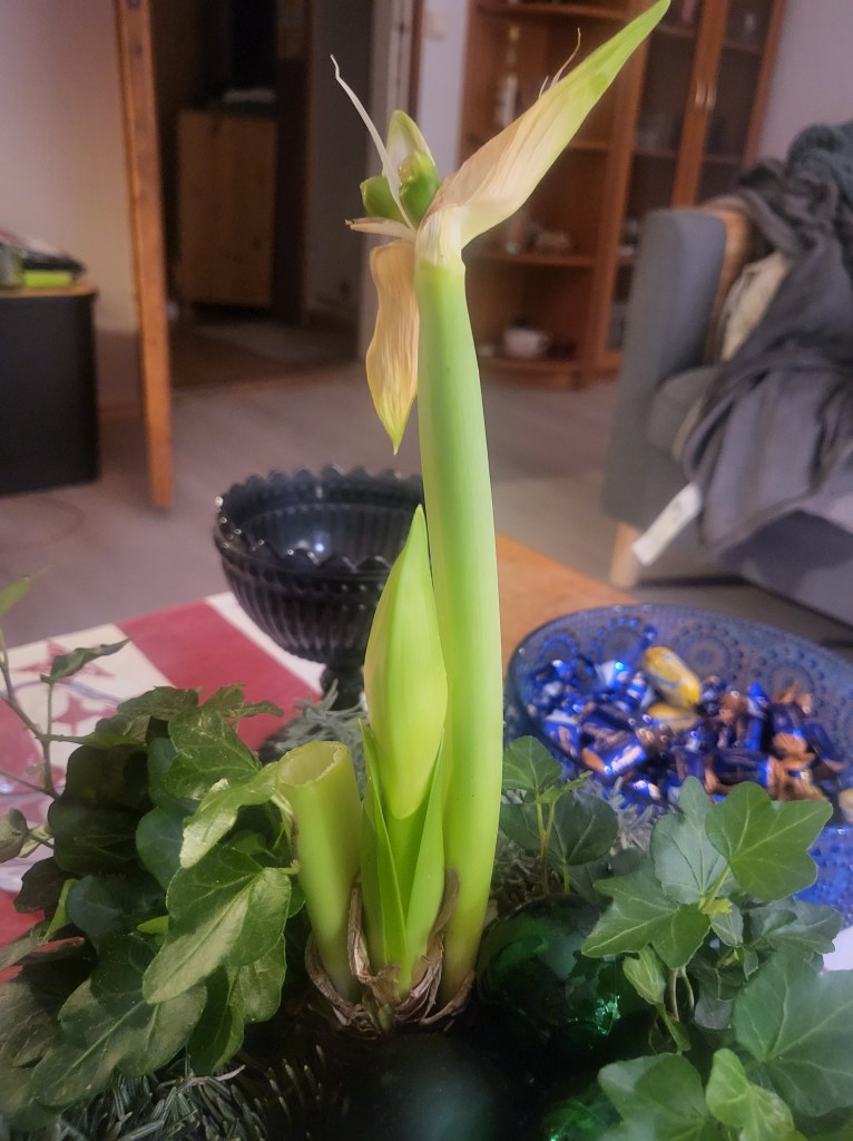 Ihmettelyssä riittää. Nappasin matkaani elämäänsä kyllästyneeltä näyttäneen amarylliksen paikallisesta marketista ja kas. Tilkka vettä, kauniita sanoja ja kääreiden availua ja mikäs sieltä sitten ilmestyikään näkyviin? Toinen kukinto? Jouluksi ostamani amaryllis puolestaan yllätti tekemällä vielä kolmannen kukkavarren, hoitohan on ollut vähän mitä sattuu, sillä harjoittelijana tässä mennään.