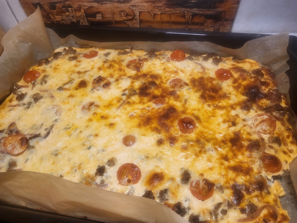 Tässä menneenä iltana otin ja touhusin pikana jauhelihapiirakan, äidin kirjeitä lukiessa tuli vähin erin nälkäkin. Pohjan ohjeen nappasin Sunnuntain sivuilta, päälliset kehittelin ihan miten sattuu. Sinihomejuustoa, kirsikkatomaatteja, hyvin maustettua jauhelihaa sekä pikkelöityä punasipulia. Tuli muuten varsin hyvä piirakka, ja pohja oli todella hyvä.